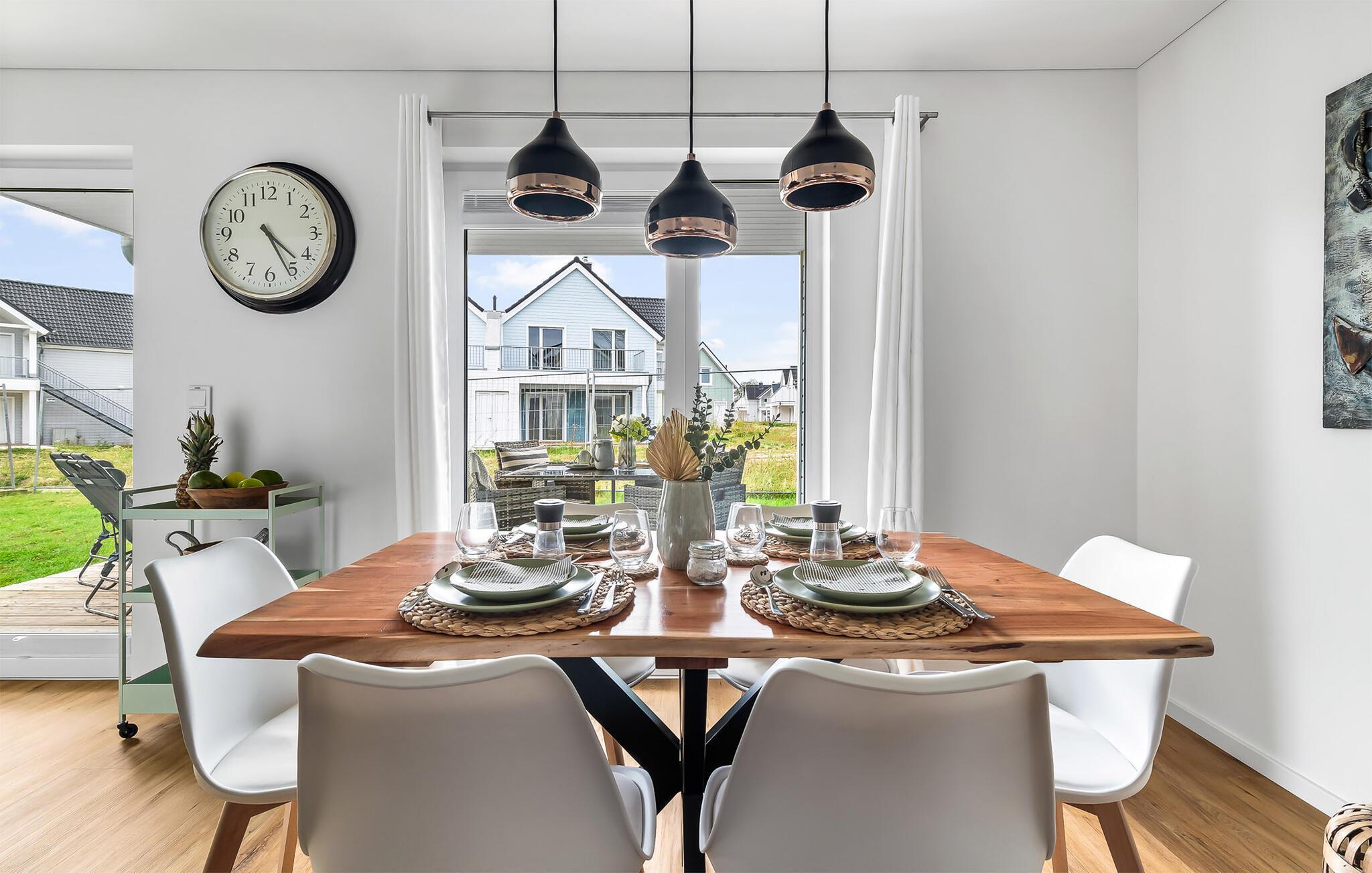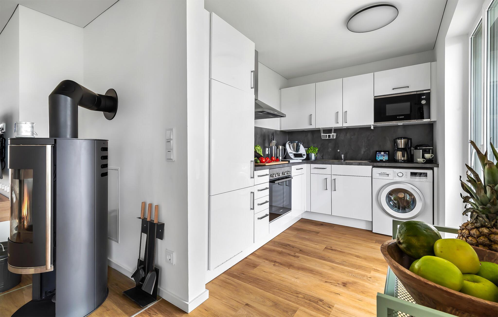 Die bestens ausgestattete Küche lässt keine Wünsche offen. Hier gibt es sogar einen Thermomix. Durch die offene Gestaltung Richtung Wohnbereich kann man auch während des Kochens gemeinsam Zeit verbringen. Anschließend können die Mahlzeiten am Esstisch genossen werden.