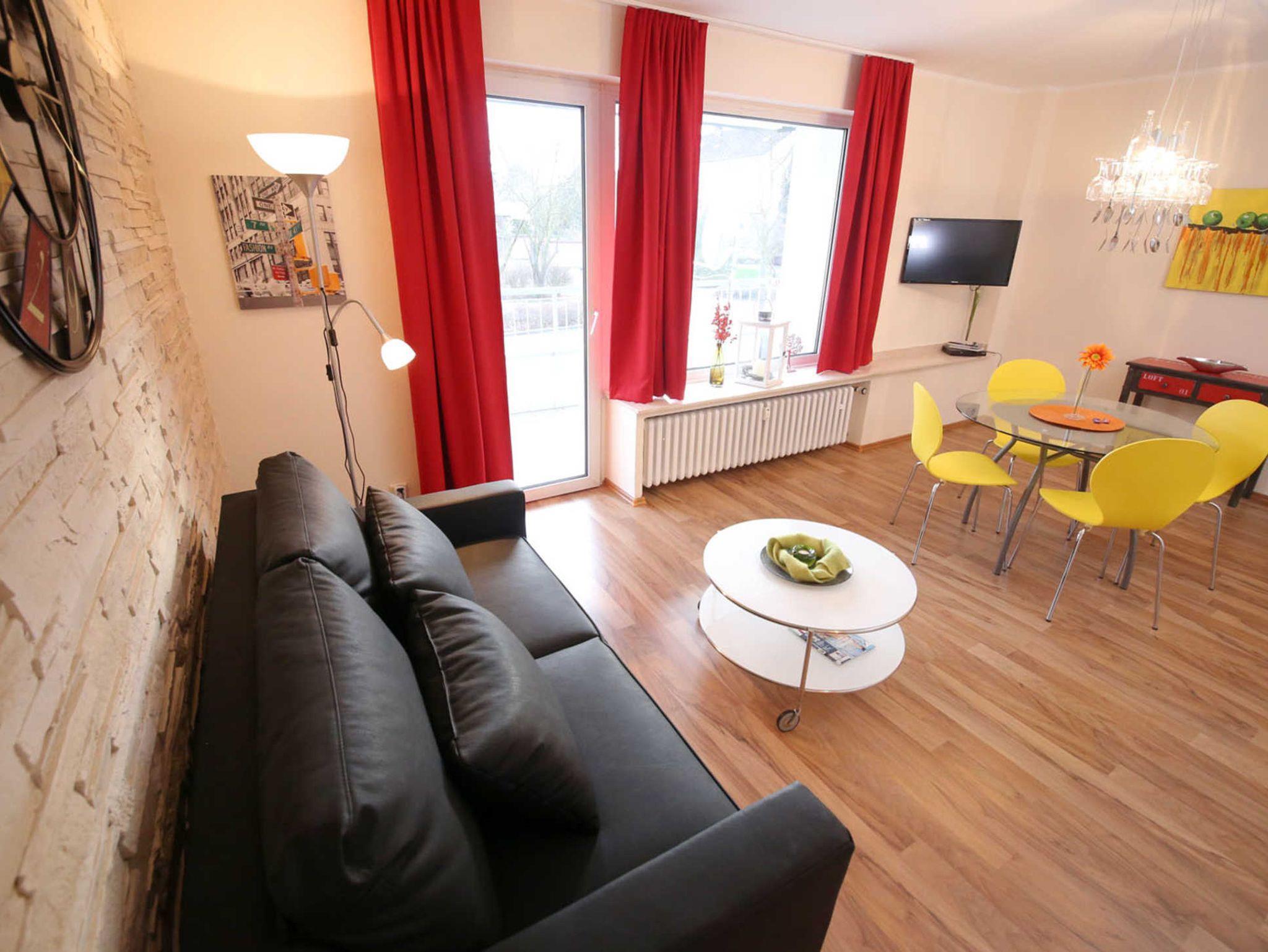 Das Wohnzimmer ist mit einer bequemen, ausziehbaren Schlafcouch ausgestattet, mit Flachbild-TV, DVD-Player und Hifi-Anlage.