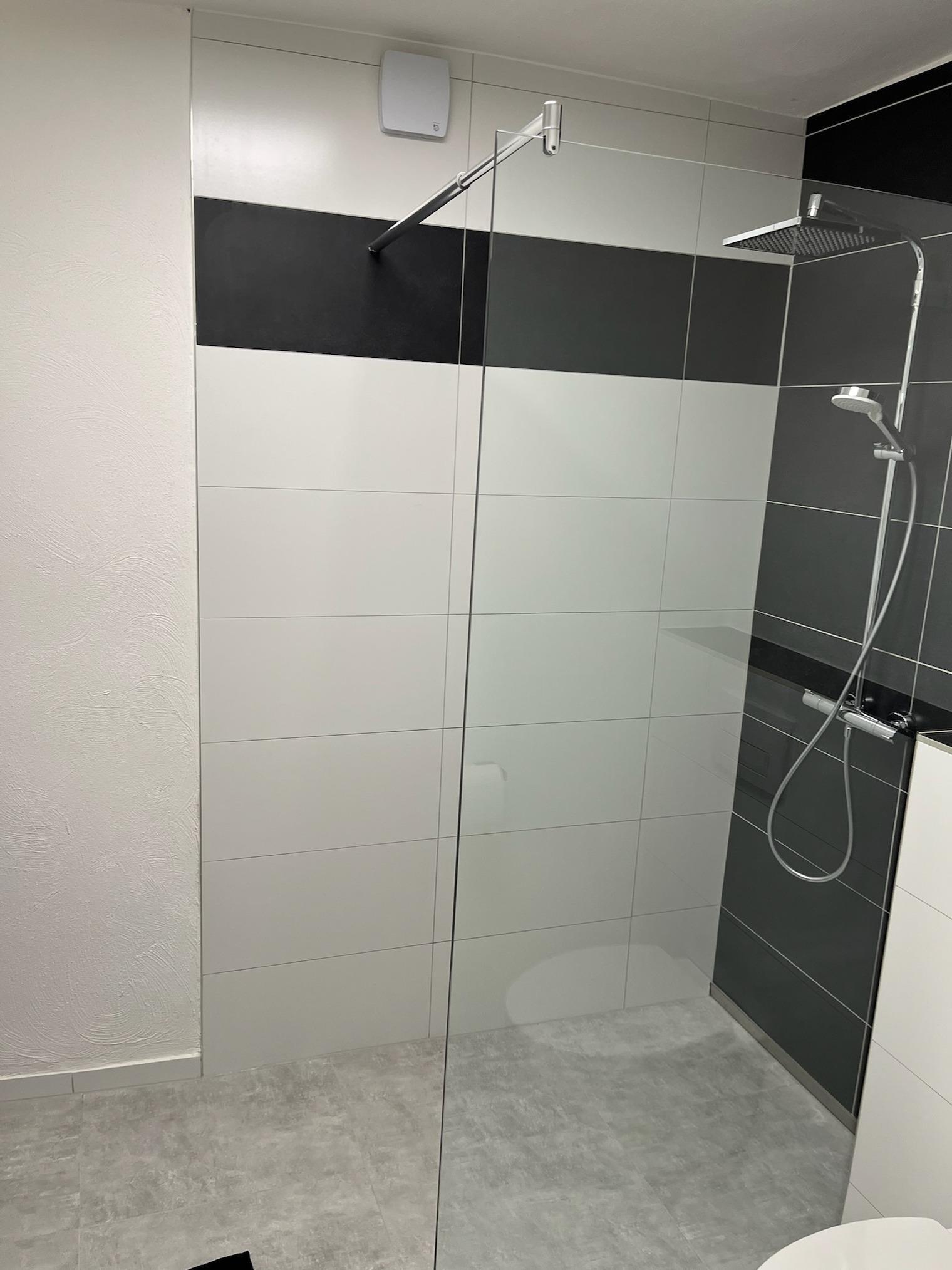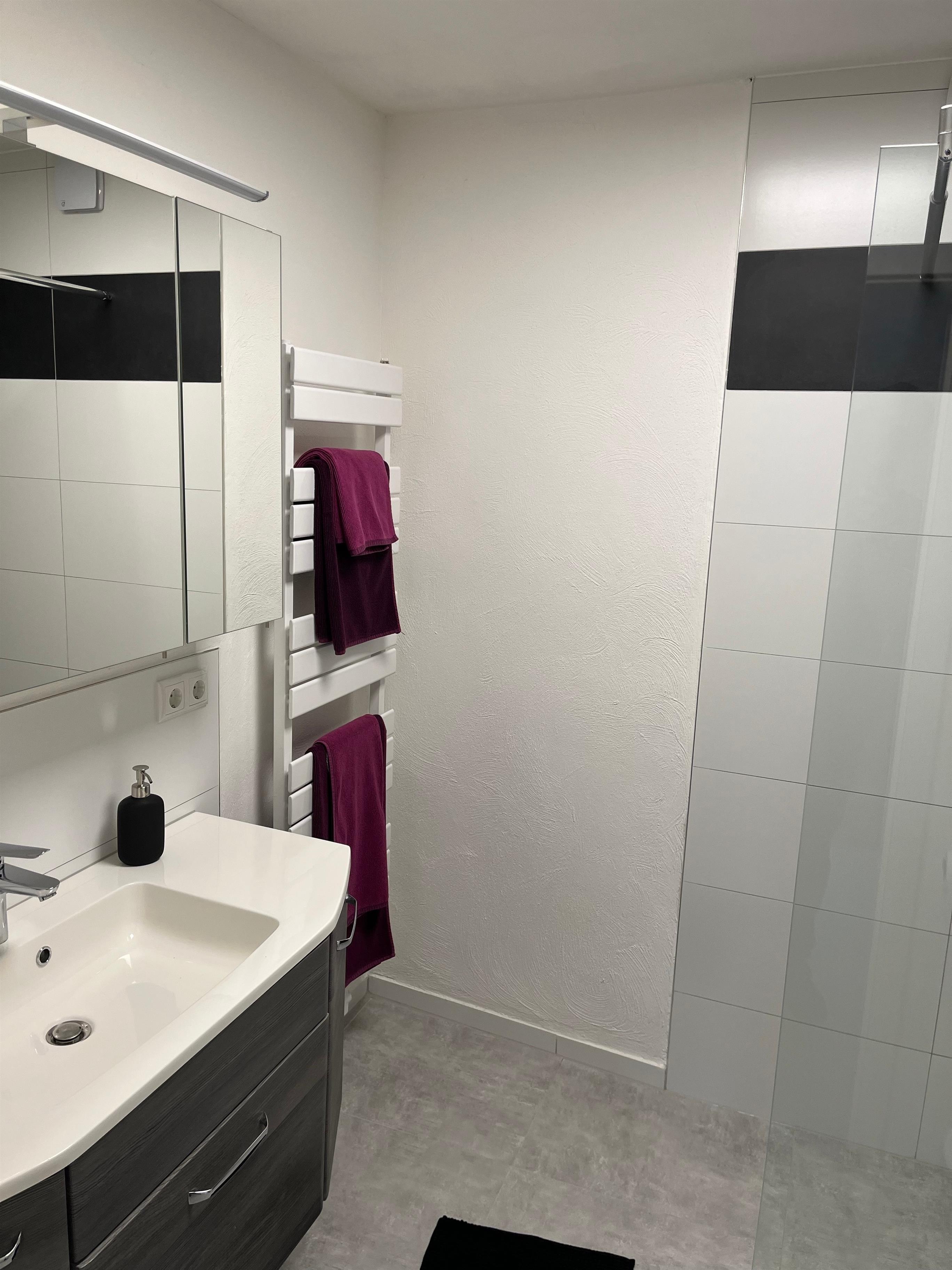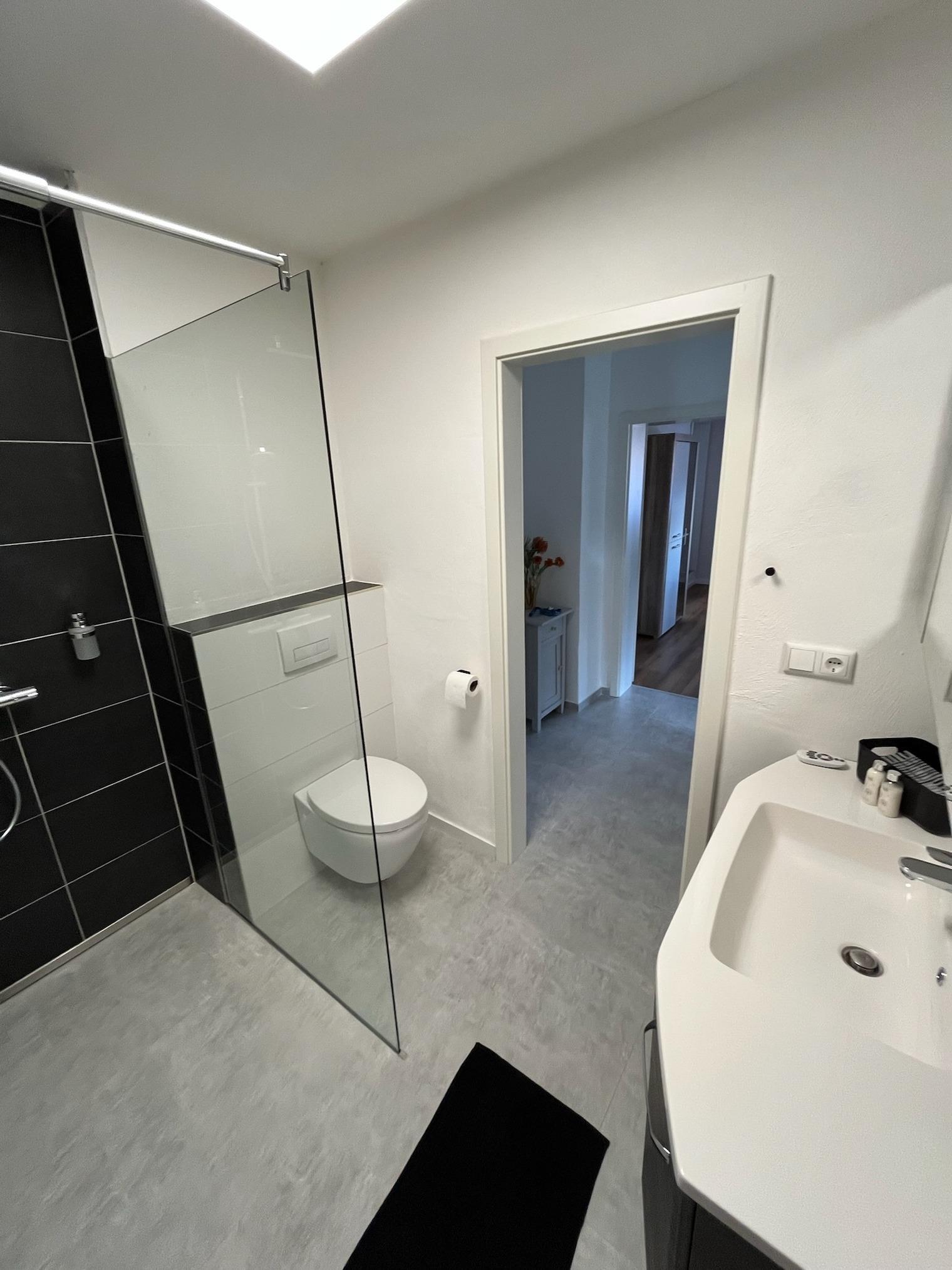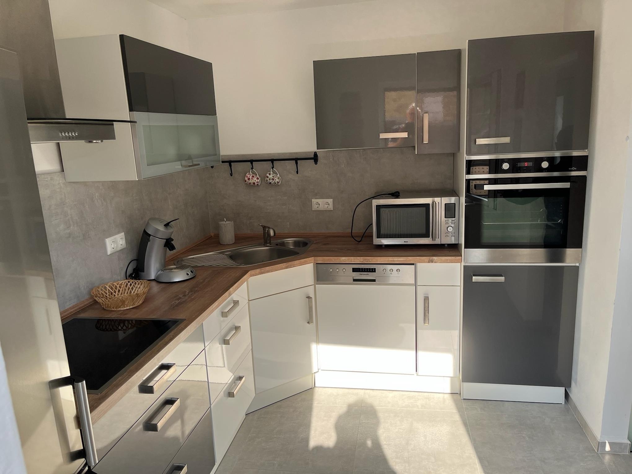 Die eigene Küche ist hochwertig ausgestattet – inklusive Geschirrspüler, Backofen, Cerankochfeld, Kaffeemaschine und Mikrowelle. Das Badezimmer verfügt über eine bodengleiche Dusche, Handtuchheizung und stilvolle Details in Schwarz-Weiß-Optik.