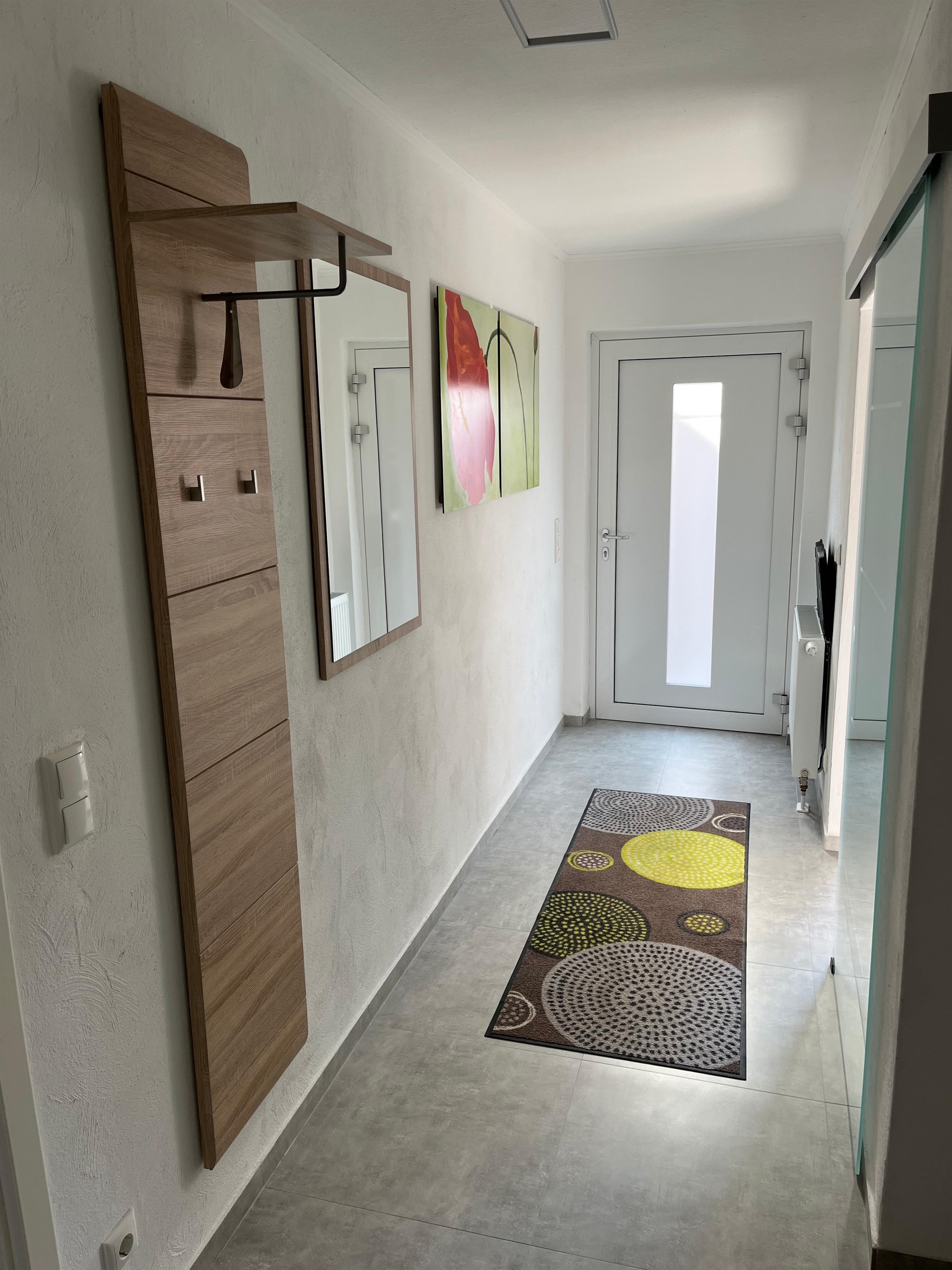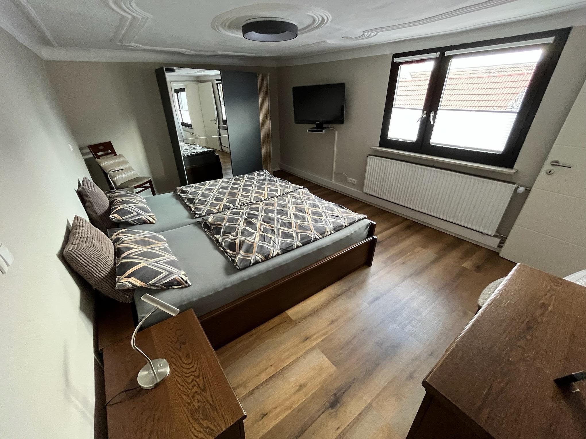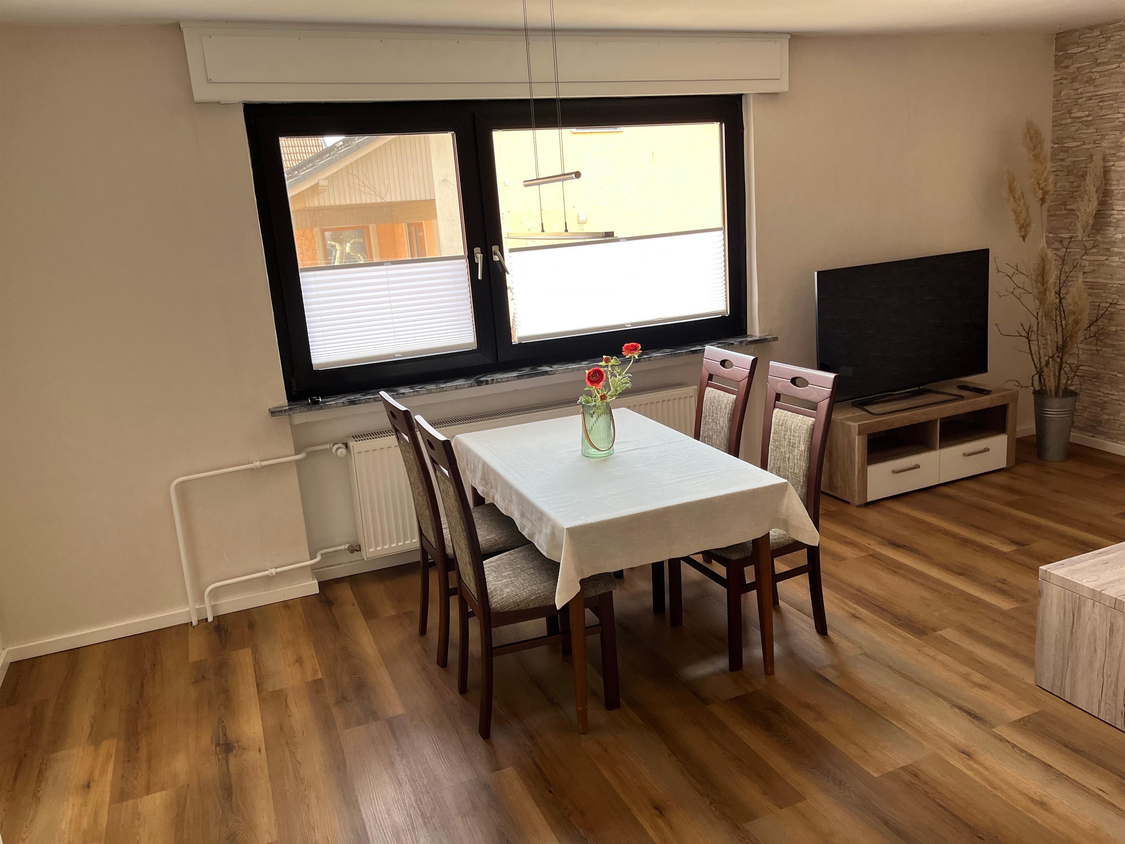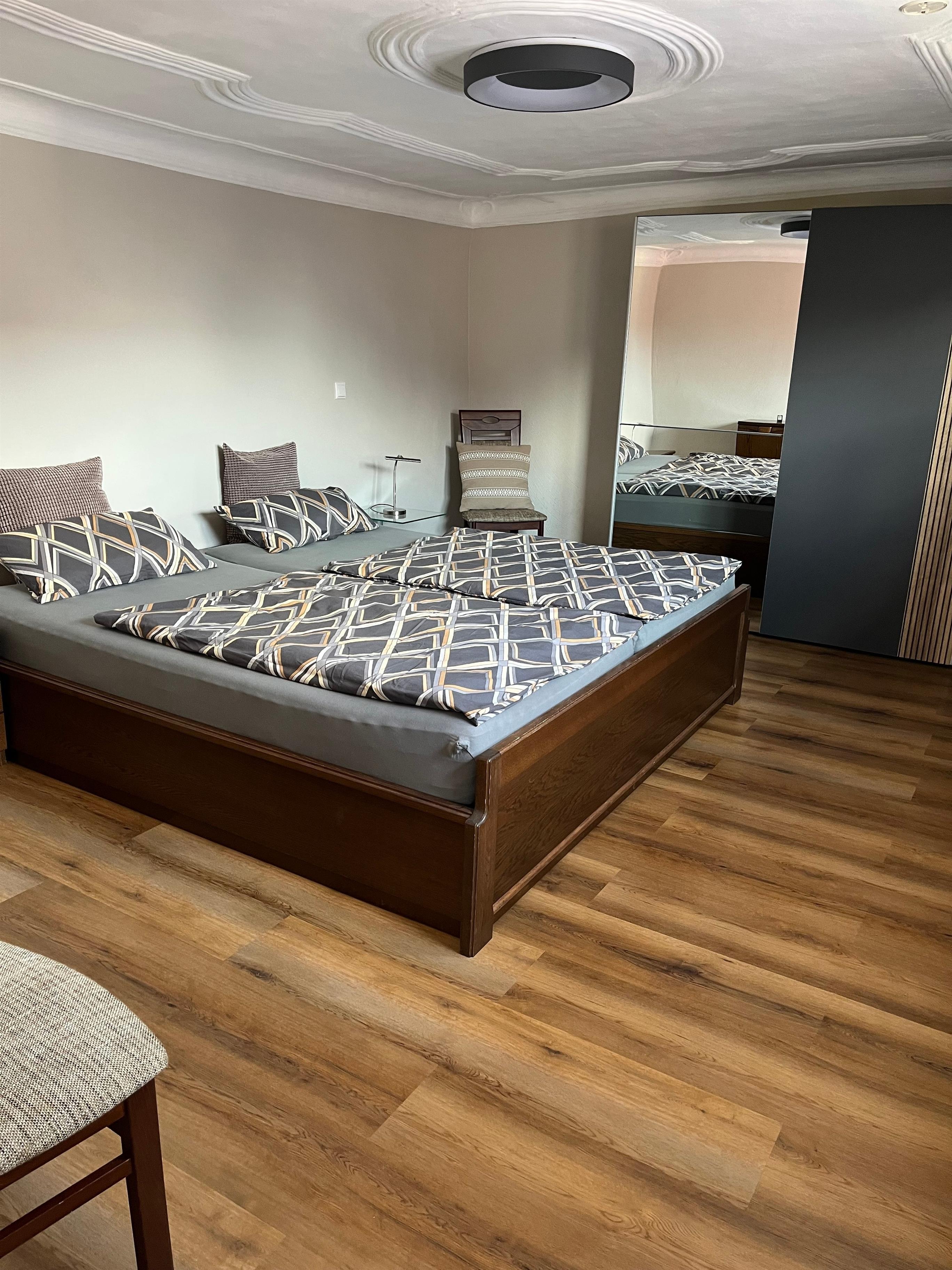 Die Ferienwohnung wurde mit viel Liebe zum Detail eingerichtet und vereint modernen Komfort mit gemütlichem Ambiente. Das Hauptschlafzimmer bietet ein großzügiges Doppelbett und einen geräumigen Kleiderschrank. Im zweiten Schlafzimmer steht ein französisches Doppelbett (1,40m) zur Verfügung. Das Wohnzimmer lädt mit einem großen Ecksofa und einem Flachbild-TV zum Entspannen ein. Am Esstisch finden bis zu vier Personen bequem Platz.