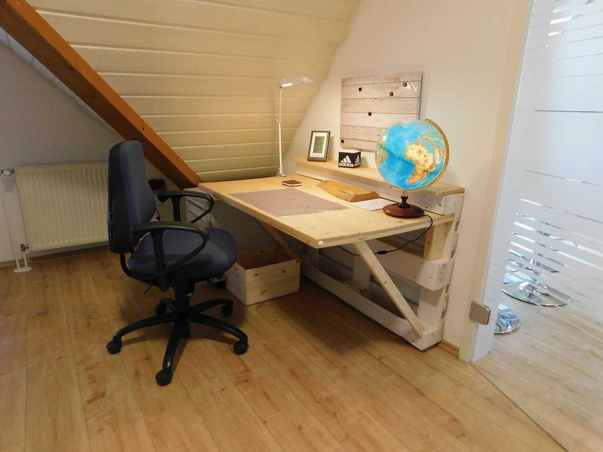 - Im weiteren Arbeitszimmer steht ihnen zusätzlich noch eine Couch/Liege mit Ausziehbett (je 2mx0,9m) zur Verfügung. Es befinden sich hier auch ein Schreibtisch mit Rollcontainer, ein Bürostuhl, ein großer Spiegel, verschiedene Boxen und Aufbewahrungsmöglichkeiten.