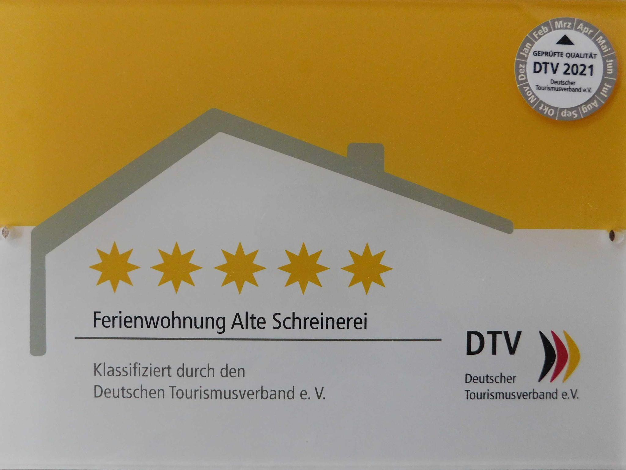 Um diesem Komfort Ausdruck zu verleihen, haben wir uns entschieden, unsere Wohnung objektiv durch die DTV-Klassifizierung bewerten zu lassen. Wir sind sehr stolz, denn unsere Ferienwohnung „Alte Schreinerei“ wurde bewertet und mit 5 Sternen ausgezeichnet.