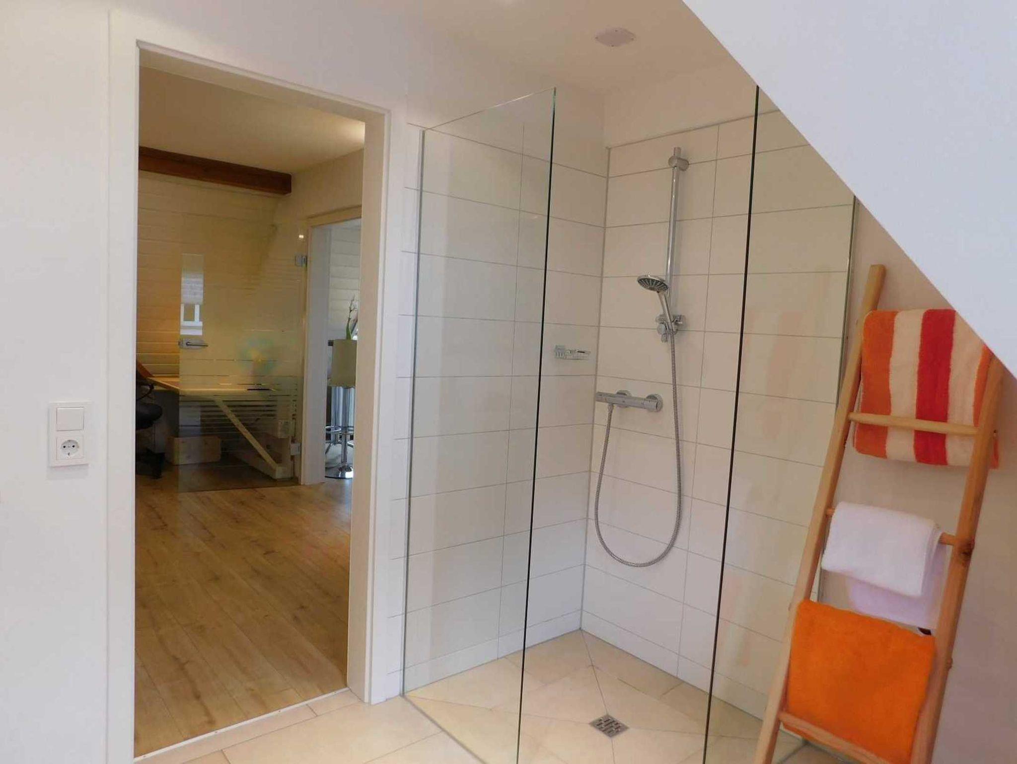 - Das Bad hat ein großes Fenster und eine ebenerdige Dusche. Es ist mit einem Föhn, einem Hocker als Wäschesammler, Kosmetikspiegel und Duschgel ausgestattet. Pro Person finden Sie dort ein größeres und zwei normale Handtücher.