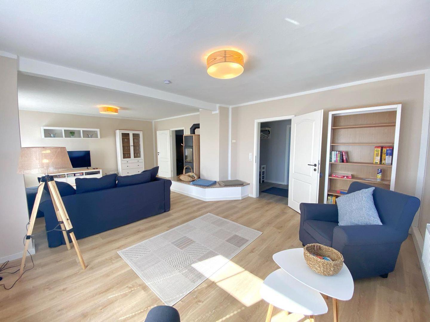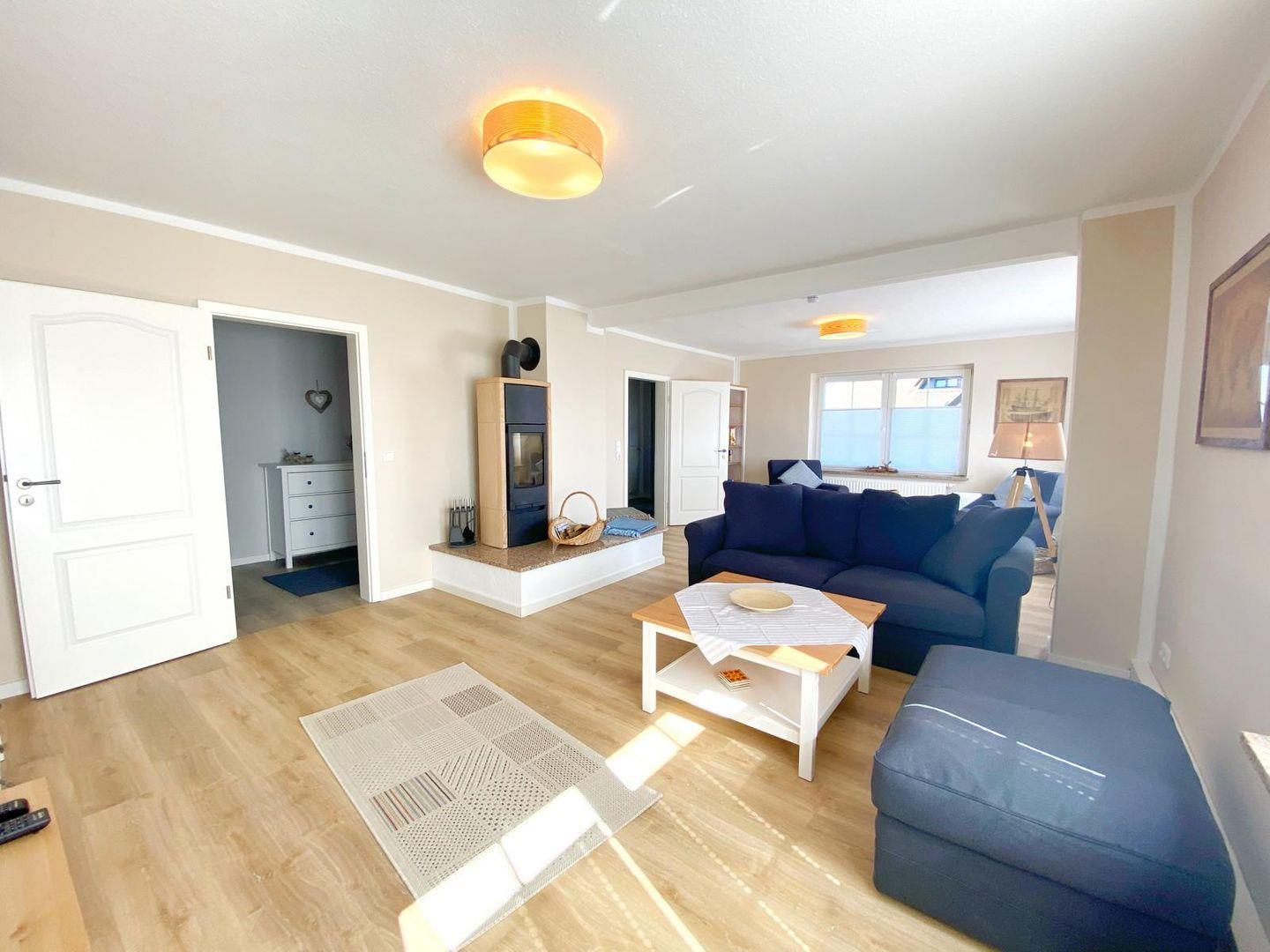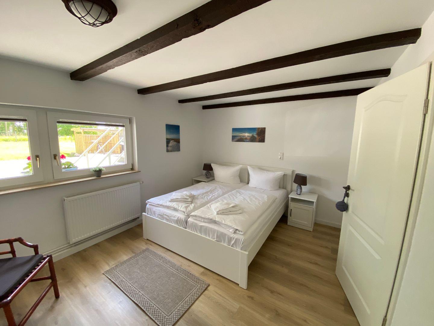 Die Ferienwohnung "Vilm" befindet sich im Erdgeschoß des Reethauses. Sie bietet auf ca. 105 qm Wohnfläche Platz für maximal 5 Personen. Die komplett im Jahr 2020 sanierte und neu möblierte Wohnung besteht aus einem sehr großen gemütlichen Wohnzimmer mit Kamin, Flachbild-TV und DVD-Player sowie aus zwei separaten Schlafzimmern mit je einem Doppelbett. Im Wohnzimmer gibt es eine Schlafcouch, wo eine weitere Person übernachten kann. Die geräumige Landhausküche ist komplett eingerichtet und bietet neben einem Ceranherd, Backofen, Geschirrspüler, Mikrowelle natürlich auch Kaffeemaschine, Toaster, Radio und Wasserkocher. Von ihr gelangt man auf die direkt zur Ferienwohnung gehörende 15qm große Terrasse mit Sitzmöbeln und einem wunderschönen Blick über den Bauerngarten und die angrenzende Landschaft. Im großzügigen Bad gibt es eine Dusche, WC und einen Haartrockner. Eine Waschmaschine steht zur gemeinschaftlichen Nutzung zur Verfügung ( von außen in den Keller ). Ein Kinderbett sowie ein Hochstuhl sind vorhanden. Die angrenzende Wiesen- und Boddenlandschaft bietet Freunden des ruhigen, sanften naturnahen Tourismus, insbesondere den Radlern, Reitsportlern, Anglern und Seglern ideale Bedingungen.