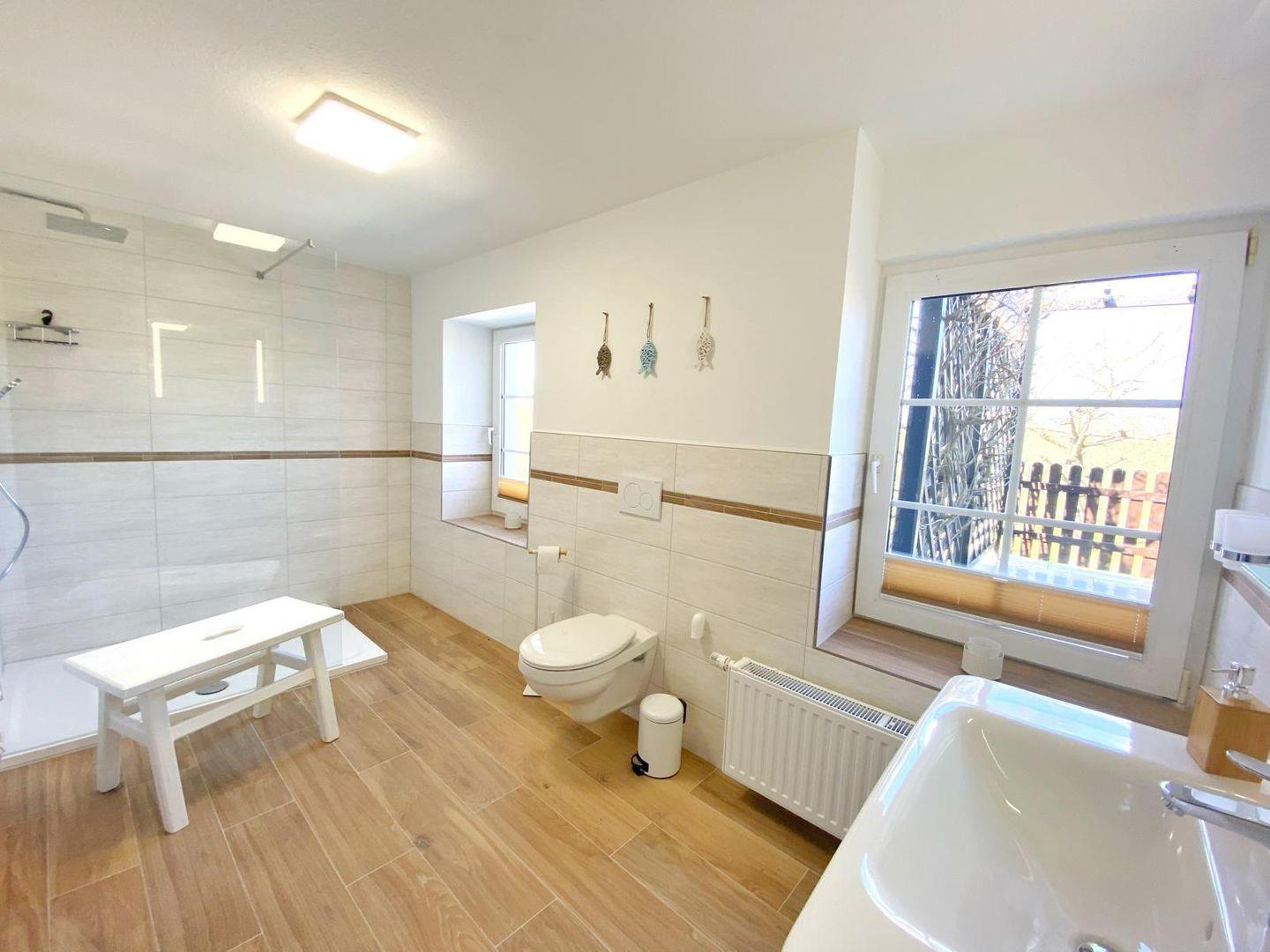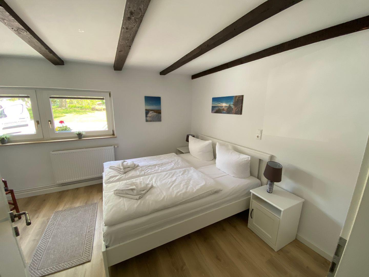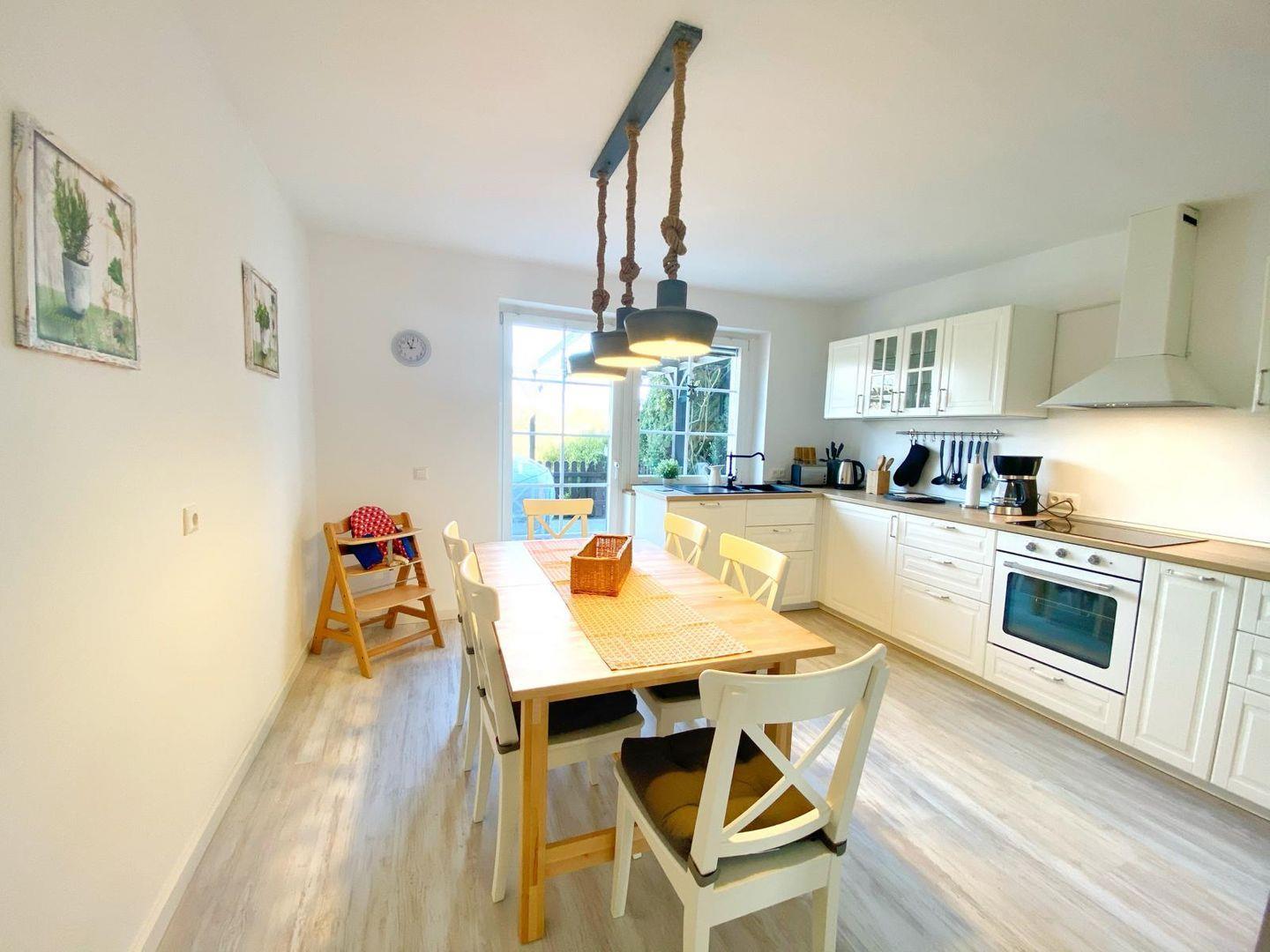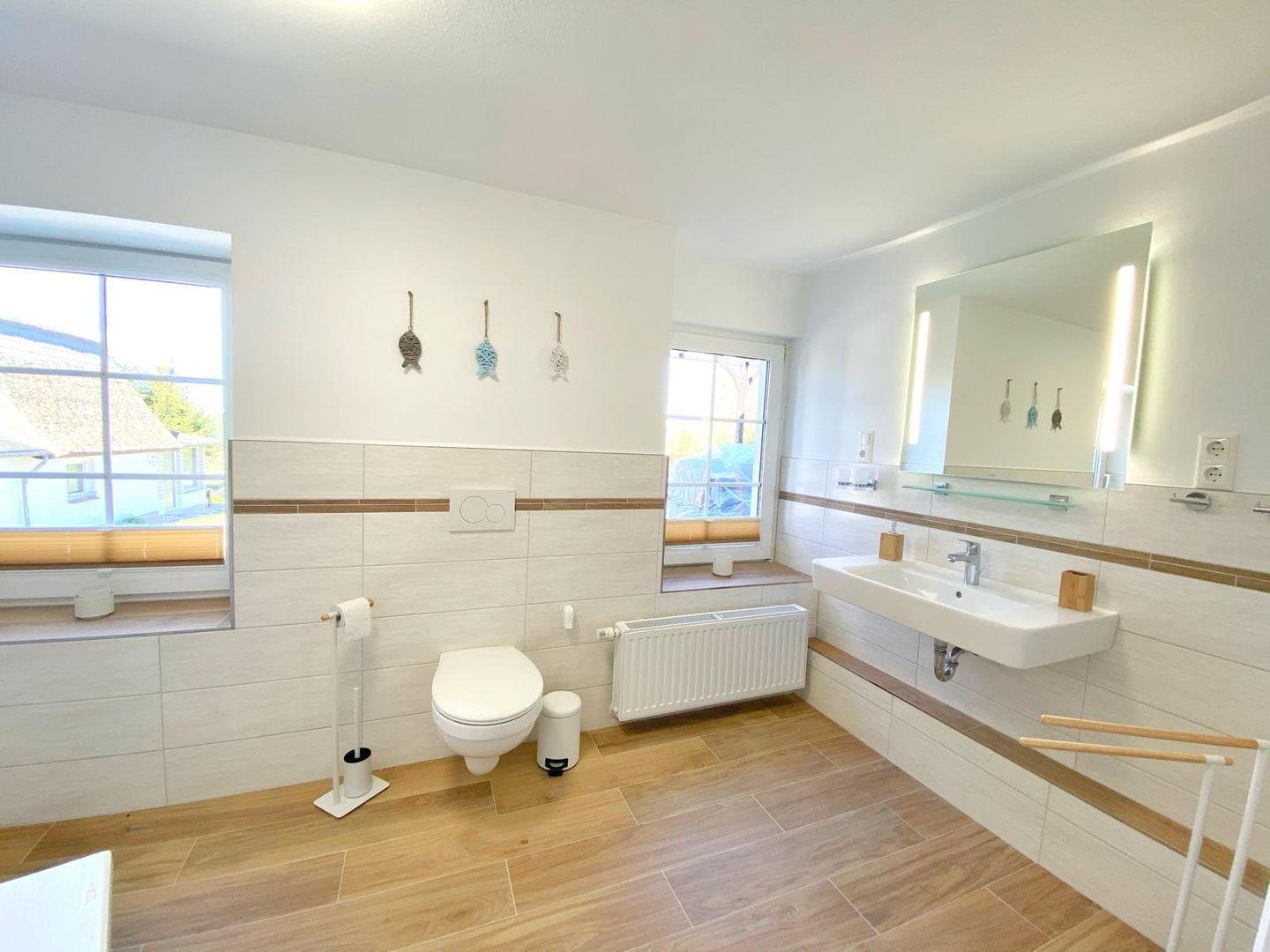 Die Ferienwohnung "Vilm" befindet sich im Erdgeschoß des Reethauses. Sie bietet auf ca. 105 qm Wohnfläche Platz für maximal 5 Personen. Die komplett im Jahr 2020 sanierte und neu möblierte Wohnung besteht aus einem sehr großen gemütlichen Wohnzimmer mit Kamin, Flachbild-TV und DVD-Player sowie aus zwei separaten Schlafzimmern mit je einem Doppelbett. Im Wohnzimmer gibt es eine Schlafcouch, wo eine weitere Person übernachten kann. Die geräumige Landhausküche ist komplett eingerichtet und bietet neben einem Ceranherd, Backofen, Geschirrspüler, Mikrowelle natürlich auch Kaffeemaschine, Toaster, Radio und Wasserkocher. Von ihr gelangt man auf die direkt zur Ferienwohnung gehörende 15qm große Terrasse mit Sitzmöbeln und einem wunderschönen Blick über den Bauerngarten und die angrenzende Landschaft. Im großzügigen Bad gibt es eine Dusche, WC und einen Haartrockner. Eine Waschmaschine steht zur gemeinschaftlichen Nutzung zur Verfügung ( von außen in den Keller ). Ein Kinderbett sowie ein Hochstuhl sind vorhanden. Die angrenzende Wiesen- und Boddenlandschaft bietet Freunden des ruhigen, sanften naturnahen Tourismus, insbesondere den Radlern, Reitsportlern, Anglern und Seglern ideale Bedingungen.