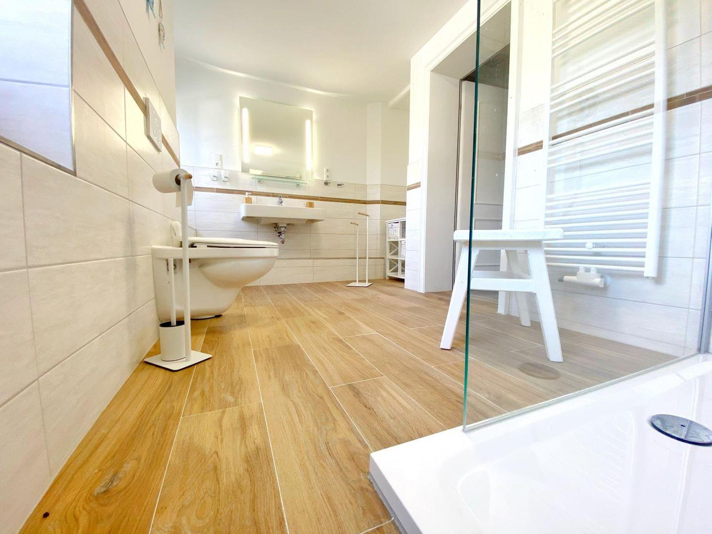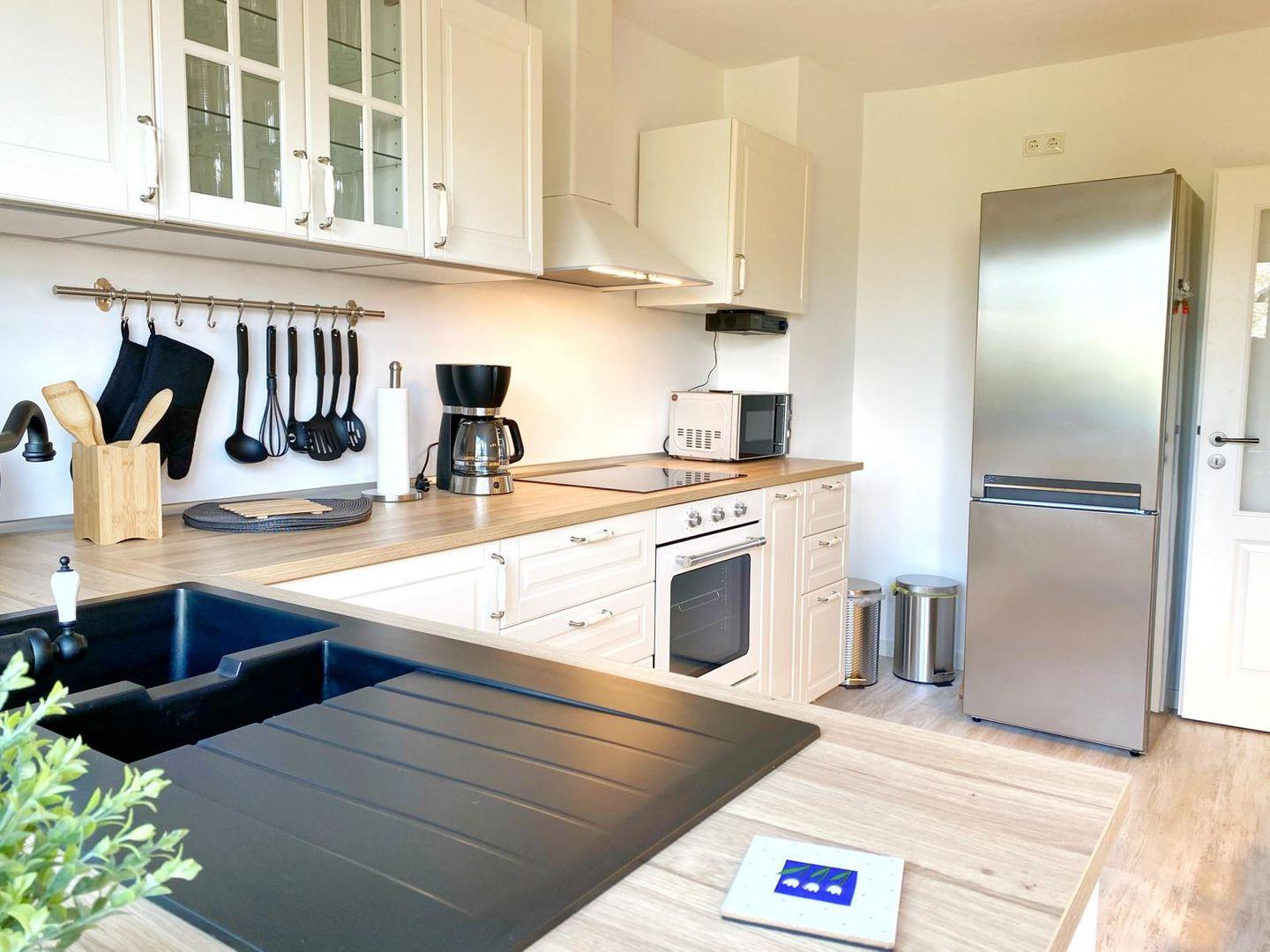 In dem kleinen, wunderschönen Örtchen Vilmnitz, direkt an der "Deutschen Alleenstraße" zwischen dem Ostseebad Binz und der zauberhaften Residenzstadt Putbus gelegen, befinden sich im reetgedeckten Ferienhaus insgesamt drei Ferienwohnungen. Die Ferienwohnung "Vilm" befindet sich im Erdgeschoß des Reetdachhauses. Die Ferienwohnungen "Goor" und "Muglitz" sind über eine separate Außentreppe im 1. OG zu erreichen. Die Wohnung "Vilm" mit einer Wohnfläche von ca. 105qm bietet Platz für maximal 5 Personen. Die Wohnung "Goor" mit einer Wohnfläche von ca. 92 qm bietet Platz für insgesamt 5 Personen. Die Wohnung "Muglitz" mit einer Wohnfläche von ca. 50 qm bietet Platz für insgesamt 3 Personen. Alle drei Wohnungen zusammen sind ideal für einen Urlaub mit Freunden oder in Großfamilie. Im liebevoll angelegten Bauerngarten stehen ausreichend Sitz-und Grillmöglichkeiten zur gemeinschaftlichen Nutzung zur Verfügung. Das insgesamt ca. 3000 qm große eingezäunte Grundstück verfügt über einen gepflasterten Vorplatz, über den man den großen Carport mit 3 Stellplätzen und Fahrradunterstellmöglichkeiten erreicht. Ihr Elektroauto können Sie während Ihres Aufenthaltes an der privaten E-Ladesäule im Carport laden. Im Haus gibt es ein WLAN und eine gemeinschaftliche Waschmaschine.
