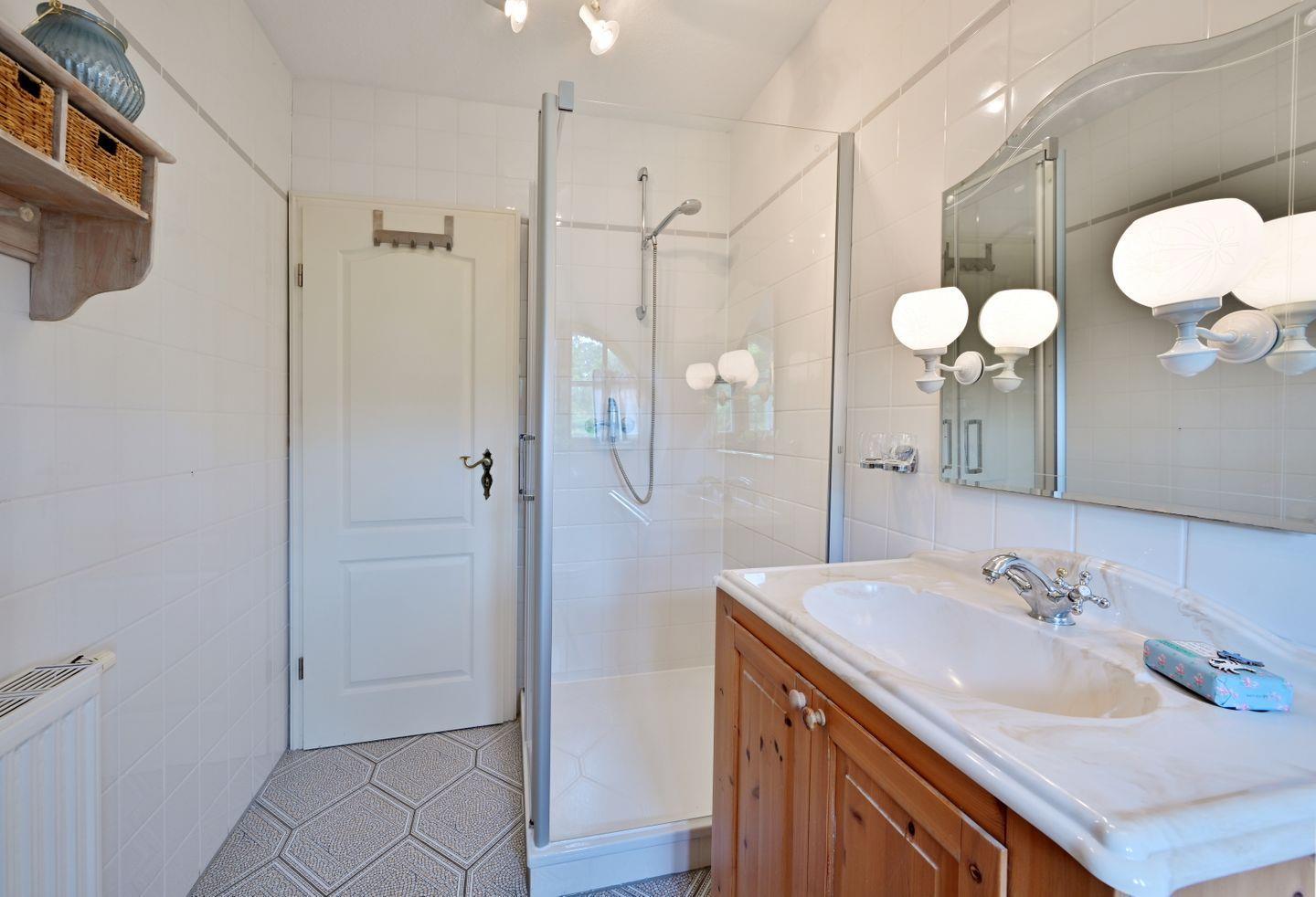 Das Bad im Obergeschoß verfügt über eine Dusche und Haartrockner und hat ein Fenster. Im Schlafzimmer gibt es ein Doppelbett.