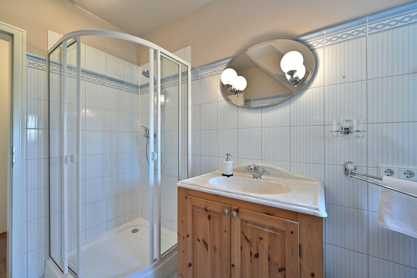 Das Bad im Obergeschoß verfügt über eine Dusche und Haartrockner und hat ein Fenster. Im Schlafzimmer gibt es ein Doppelbett.