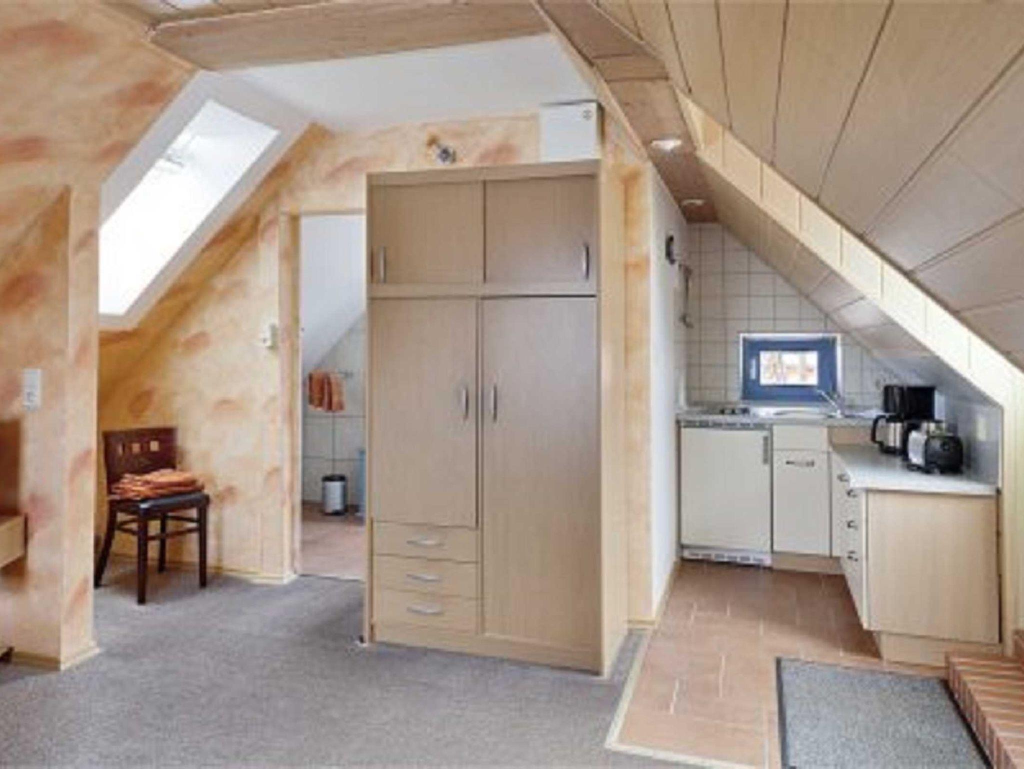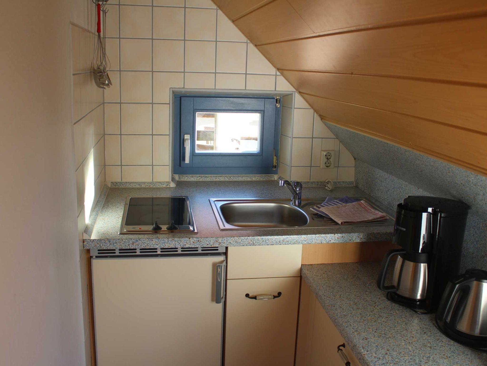 Die gemütliche 25 qm große Ferienwohnung befindet sich im Obergeschoß und ist mit einem Doppelbett (140 cm breit) und einem Schrankbett ausgestattet. Die kleine Küchenzeile verfügt über ein Kochfeld mit 2 Herdplatten, Kaffeemaschine, Toaster, Wasserkocher und Kühlschrank mit TK-Fach. Im Wohn- u. Schlafbereich befindet sich 1 Radio und Sat-TV sowie 1 Kleiderschrank. Von hier aus gelangen Sie in das geräumige Bad mit Dusche u. WC. Auf der gemütlichen Terrasse haben Sie die Möglichkeit am Abend den schönen Sonnenuntergang über der Ostsee bei einem gläschen Wein zu genießen.