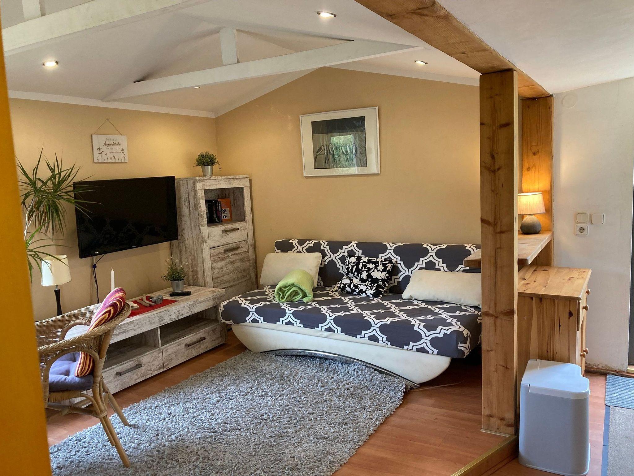 Bungalow für 2 Personen mit kleiner Küche und 2 Kochfeldern, Schlafzimmer mit Doppelbett, 1 kleiner Wohnraum, sep. Gartensitzecke und Grillplatz und einem kleinen Bad mit Dusche/WC. Kinder erst ab 3 Jahren
