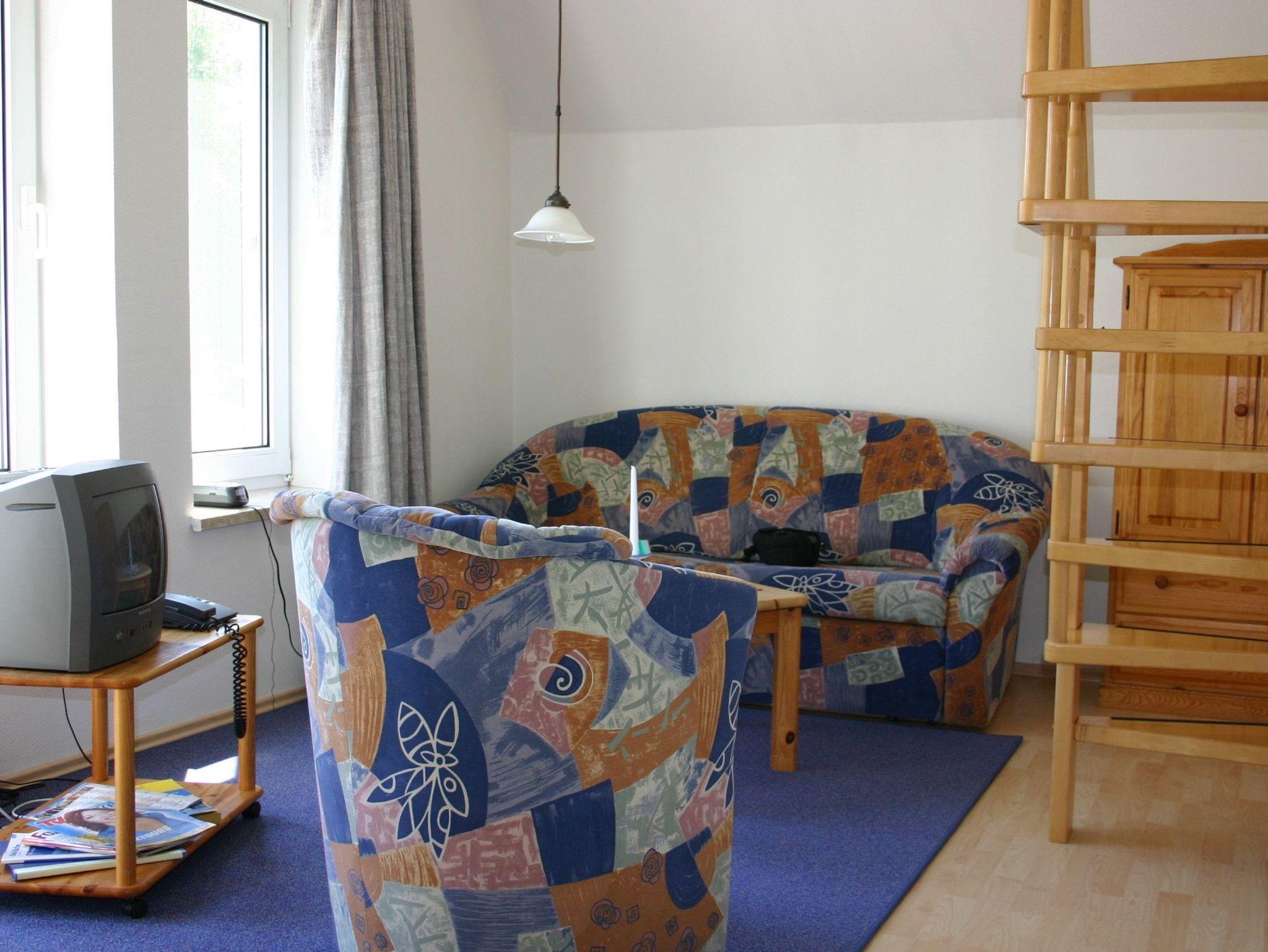 Die Ferienhaushälfte südlich von Vitte ist in Erdgeschoss und Spitzboden aufgeteilt. Der Wohnbereich ist mit einer ausziehbaren Schlafcouch, Sessel, Esstisch, Pantryküche und Farb-TV ausgestattet. Das Bad besitzt Dusche und WC. Eine Raumspartreppe führt zum offenen Schlafraum mit zwei Betten unter dem Spitzdach.