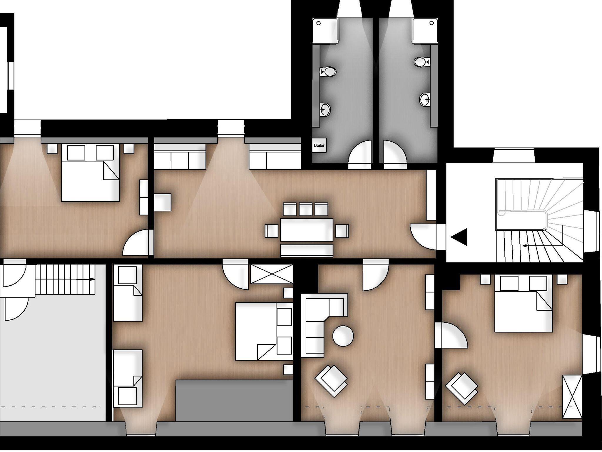 In zwei Schlafzimmern befinden sich 2 Doppelbetten. Im dritten Schlafzimmer befindet sich ein Doppelbett und 2 Einzelbetten.