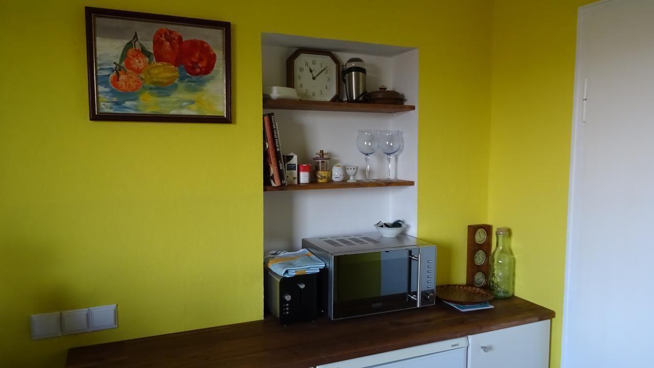 Other living room equipment : sofa bed extendable to 160 x 200 cm, armchair, cupboards, shelves, high chair, books, magazines, TV, DVD, radio