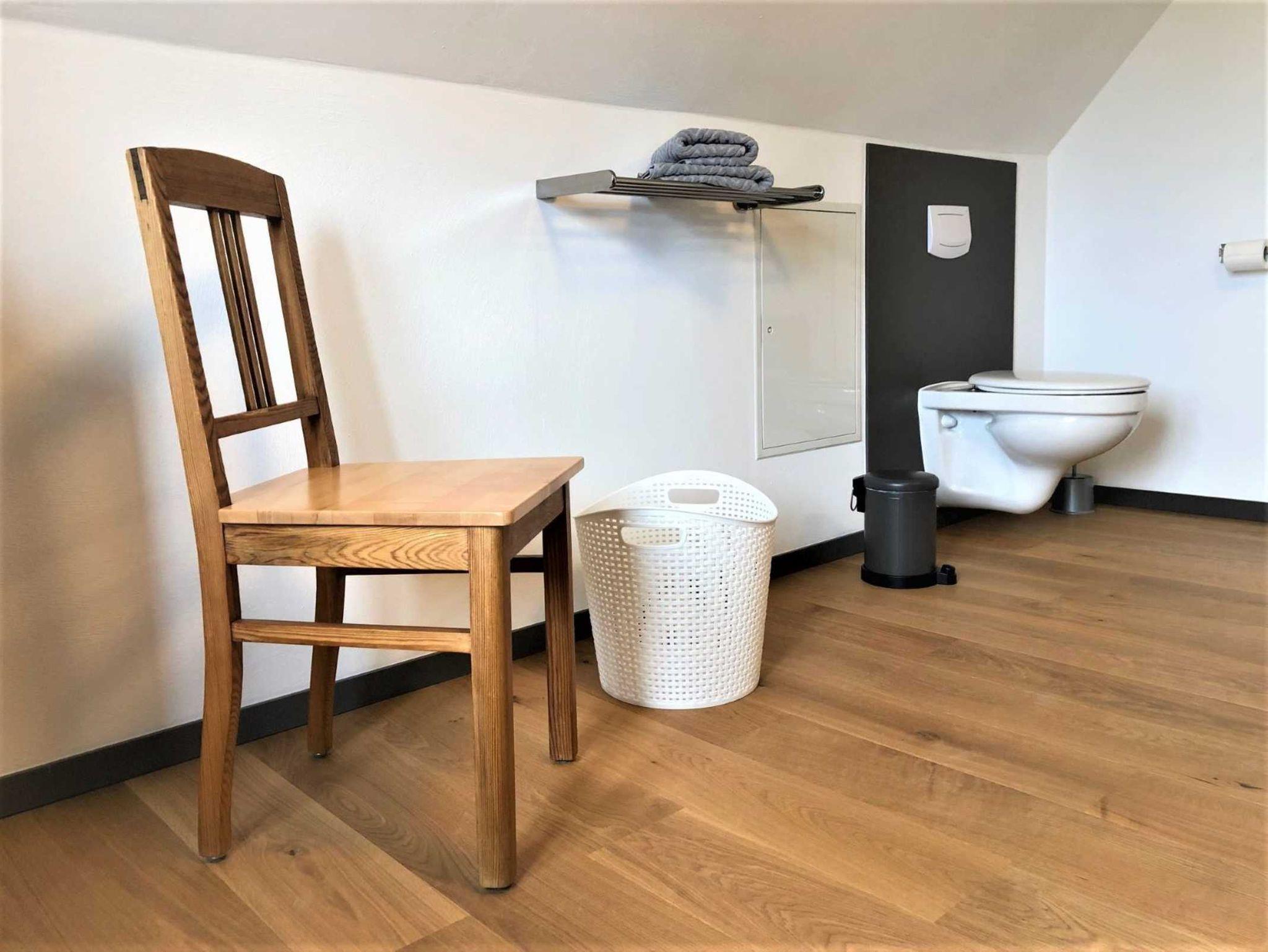 In dem ansprechenden, modernen Tageslicht-Badezimmer mit Blick auf das Haff im Obergeschoß befinden sich eine geräumige Dusche, Waschbecken und WC. Im Erdgeschoß gibt es zusätzlich ein Gäste WC mit einer Waschgelegenheit.