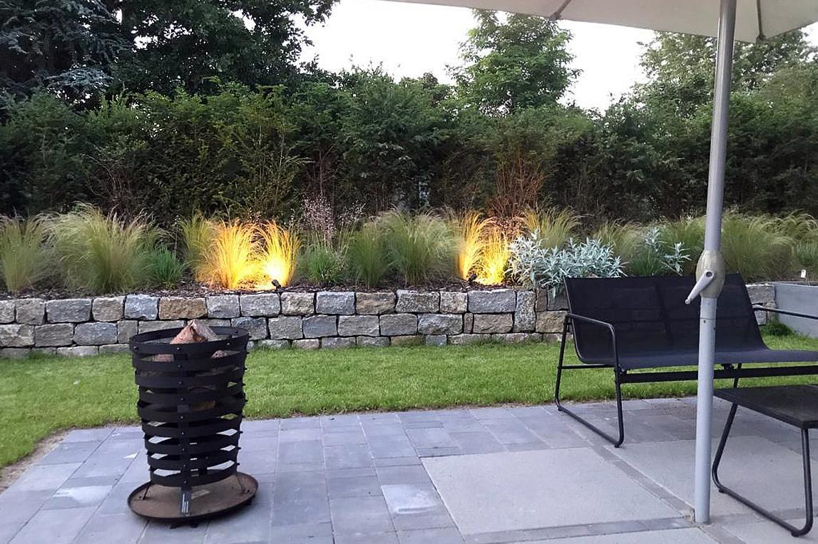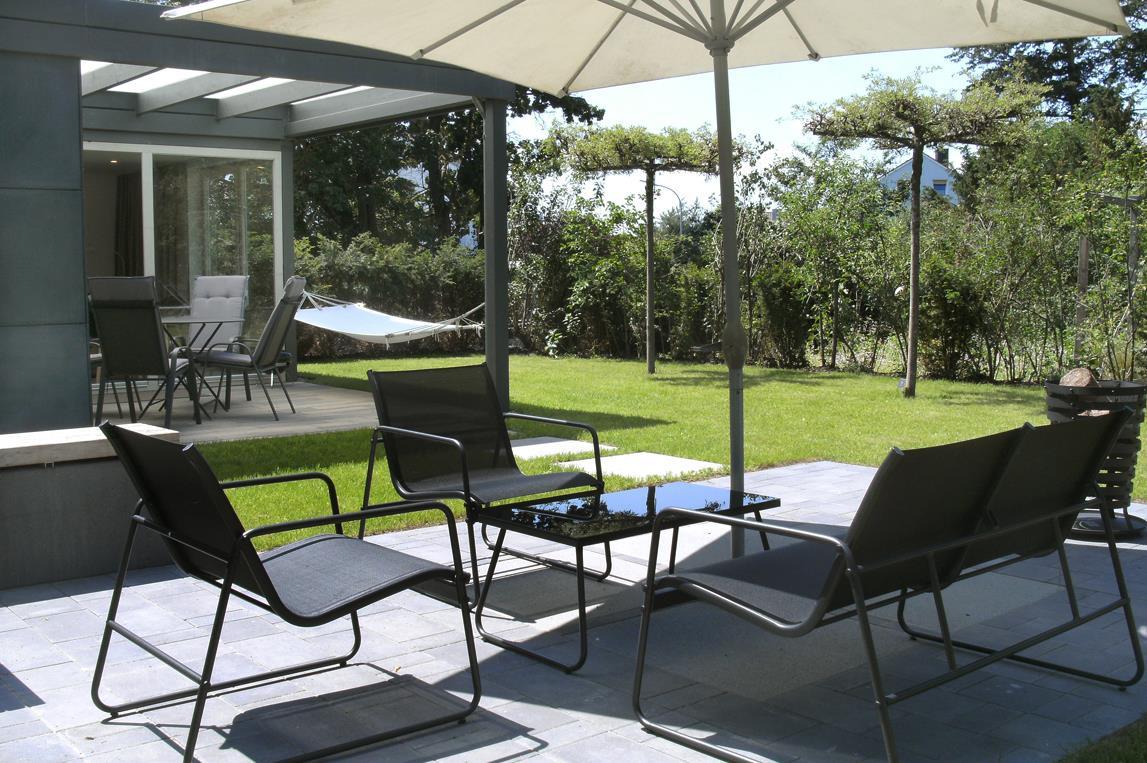 Draußen laden gleich zwei Terrassen und eine große Rasenfläche mit Tisch, Stühlen, Lounge, Relax-Stühlen und Hängematte zum Verweilen ein. Für gemütliche Abendstunden steht den Mietern ein Feuerkorb zur Verfügung - Holz gibt es reichlich.