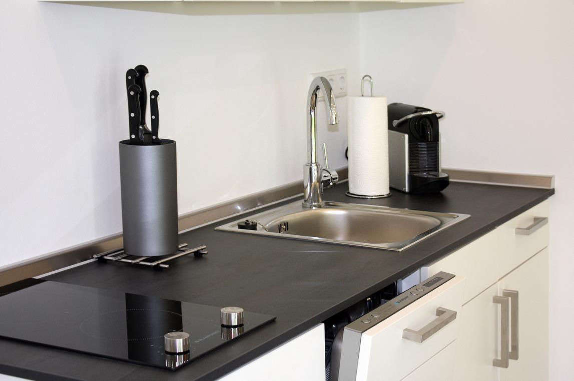 Die Küchenzeile ist mit hochwertigen Elektrogeräten (Spülmaschine, Herd, Backofen, Kühlschrank mit Gefrierfach), Kaffee (De Longhi Nespresso, selbst aufbrühen, French Press) und viel Zubehör ausgestattet.