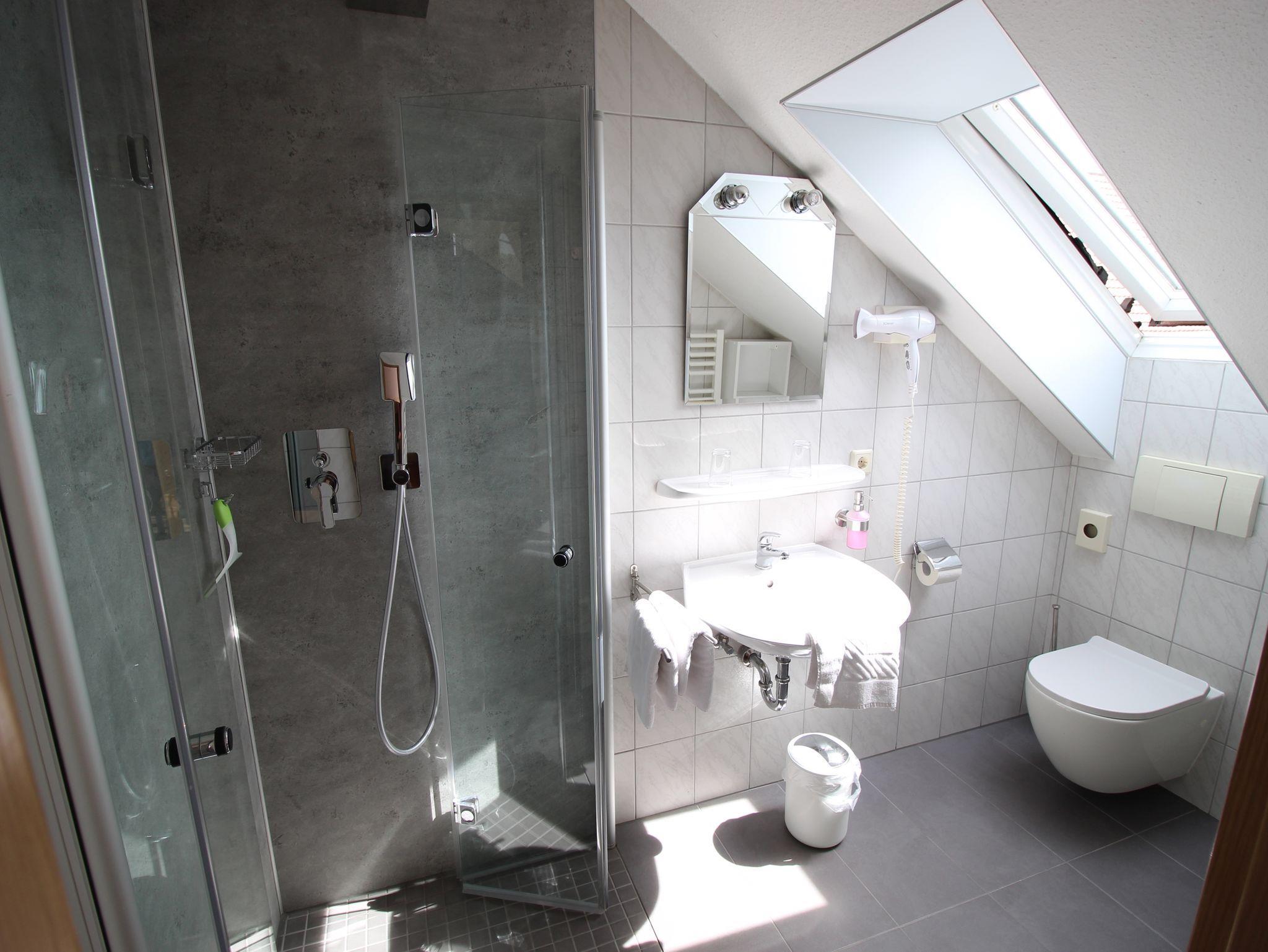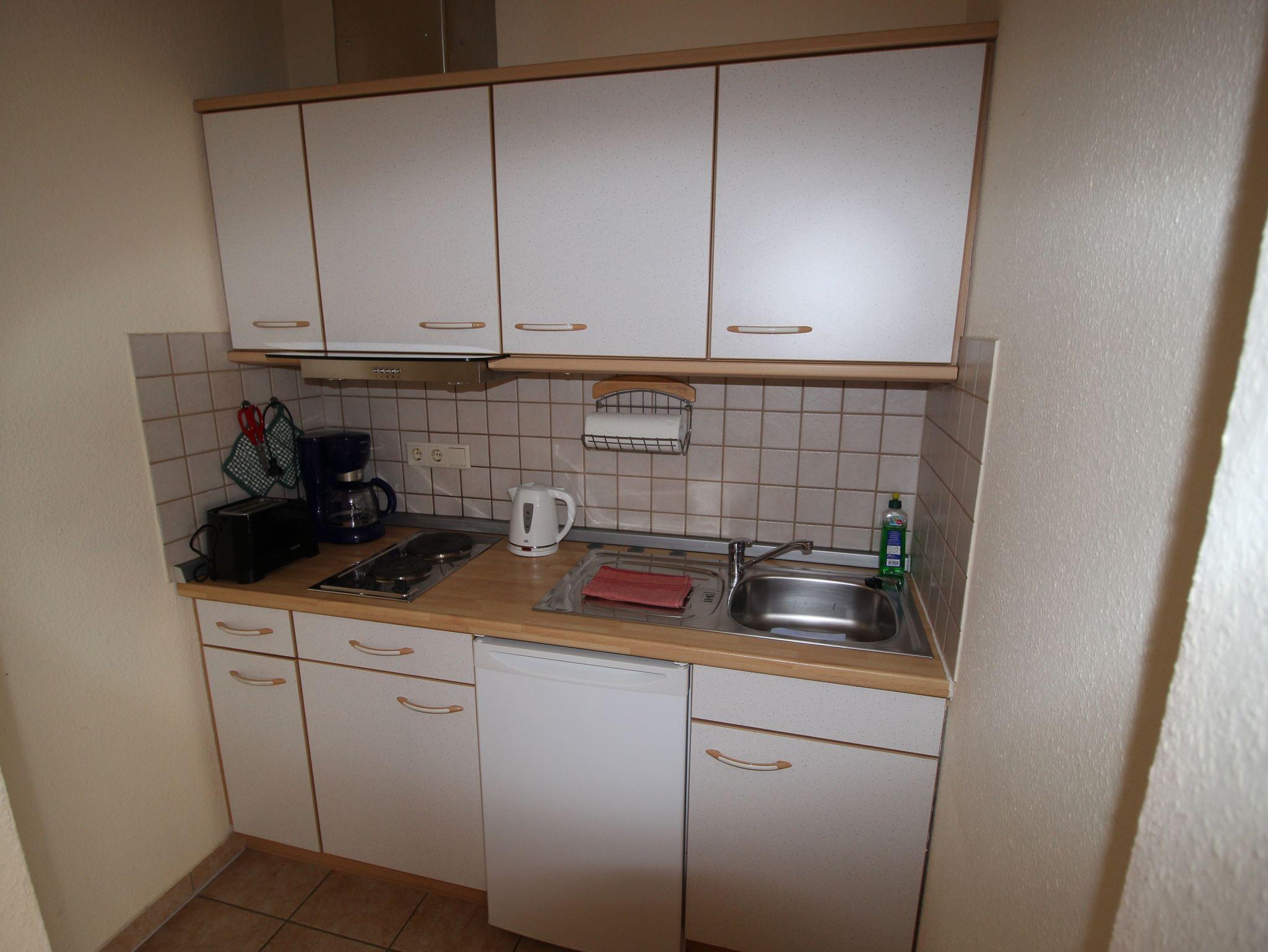 Küchenzeile und neue barrierefreie Dusche mit WC. Die Küchenzeile ist mit Kaffeemaschine, Kühlschrank, und Toaster ausgestattet.
