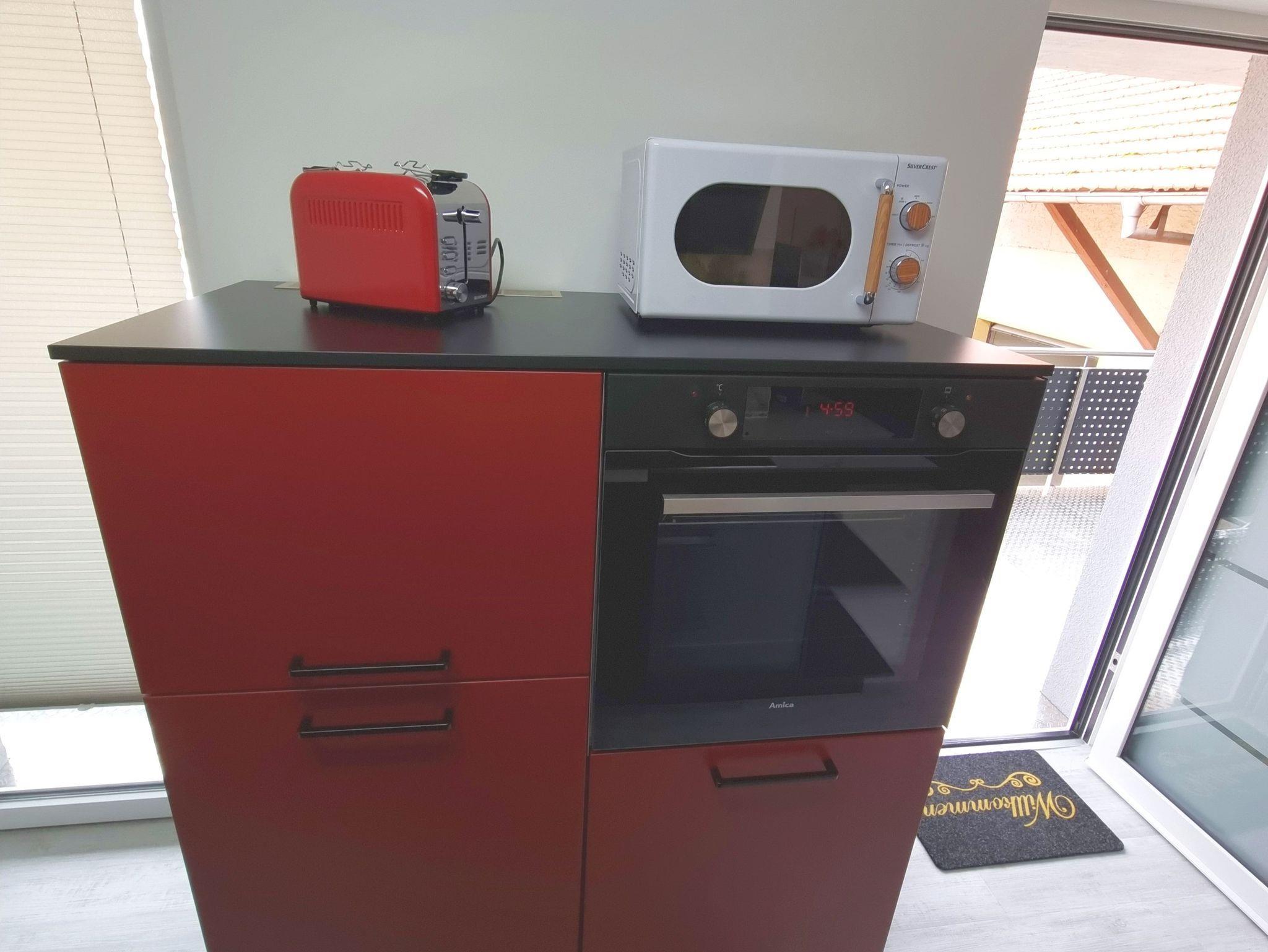 - Vollausgestattete Küche mit Toaster, Töpfe, Pfannen, Besteck, Mikrowelle, Wasserkocher, Backofen, Herd mit Ceran-Kochfeld, Kaffeemaschine, Geschirr, Gläser, Spültücher,...