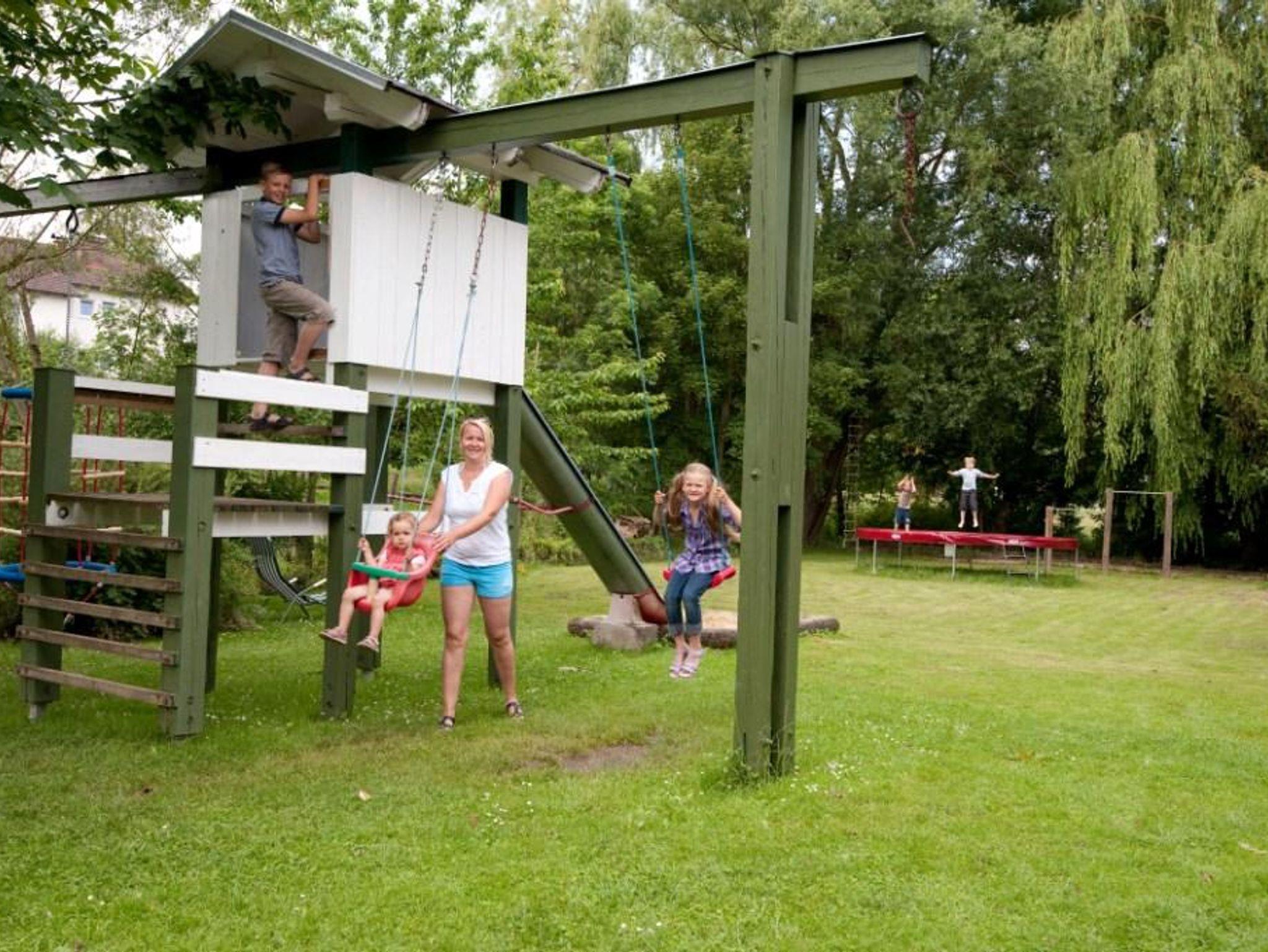 Blick zum Swimmingpool, Rießentrampolin, Spielplatz.
