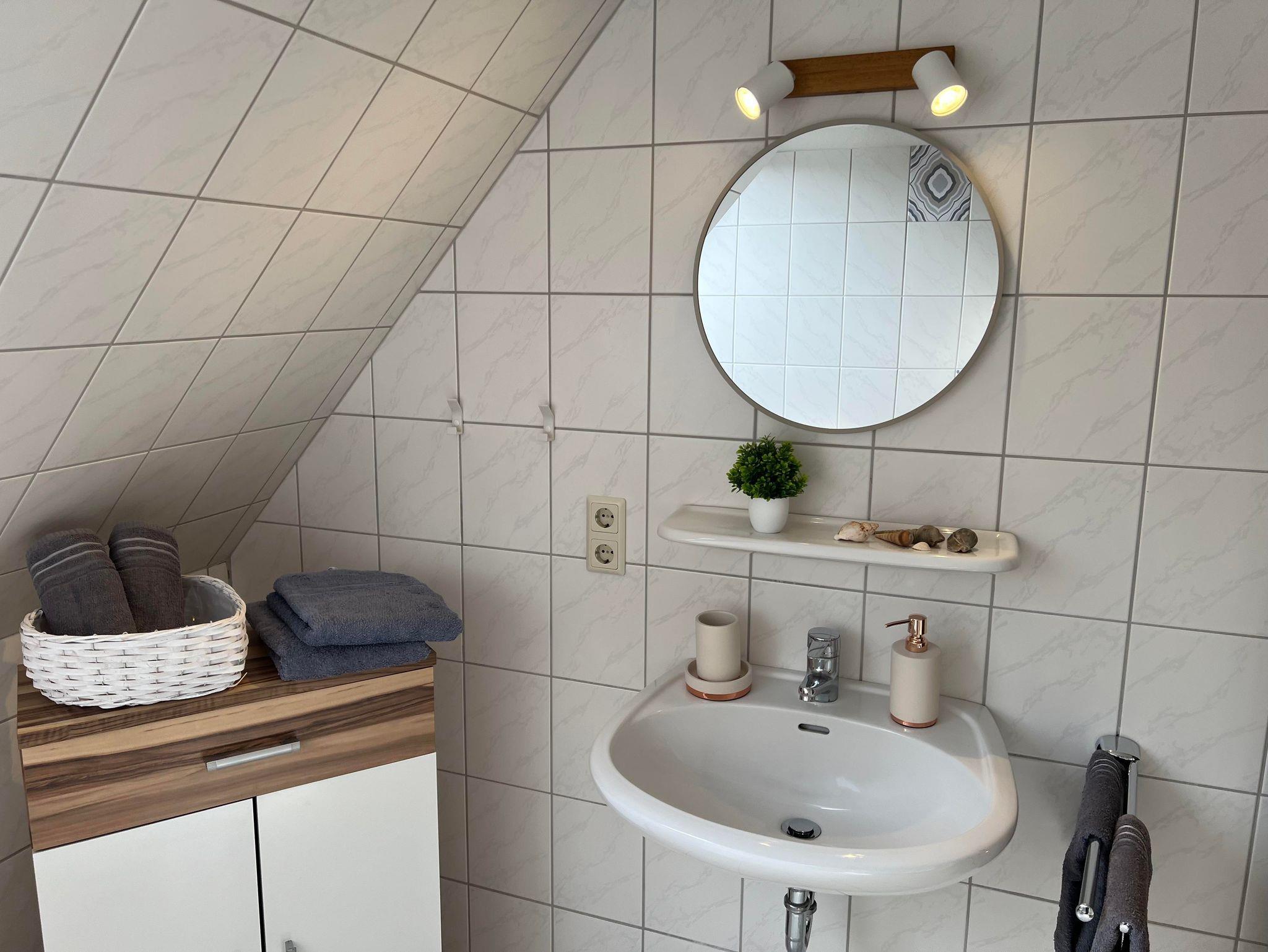 Das Duschbad ist mit einer Fußbodenheizung und ebenso mit einem Fön ausgestattet.