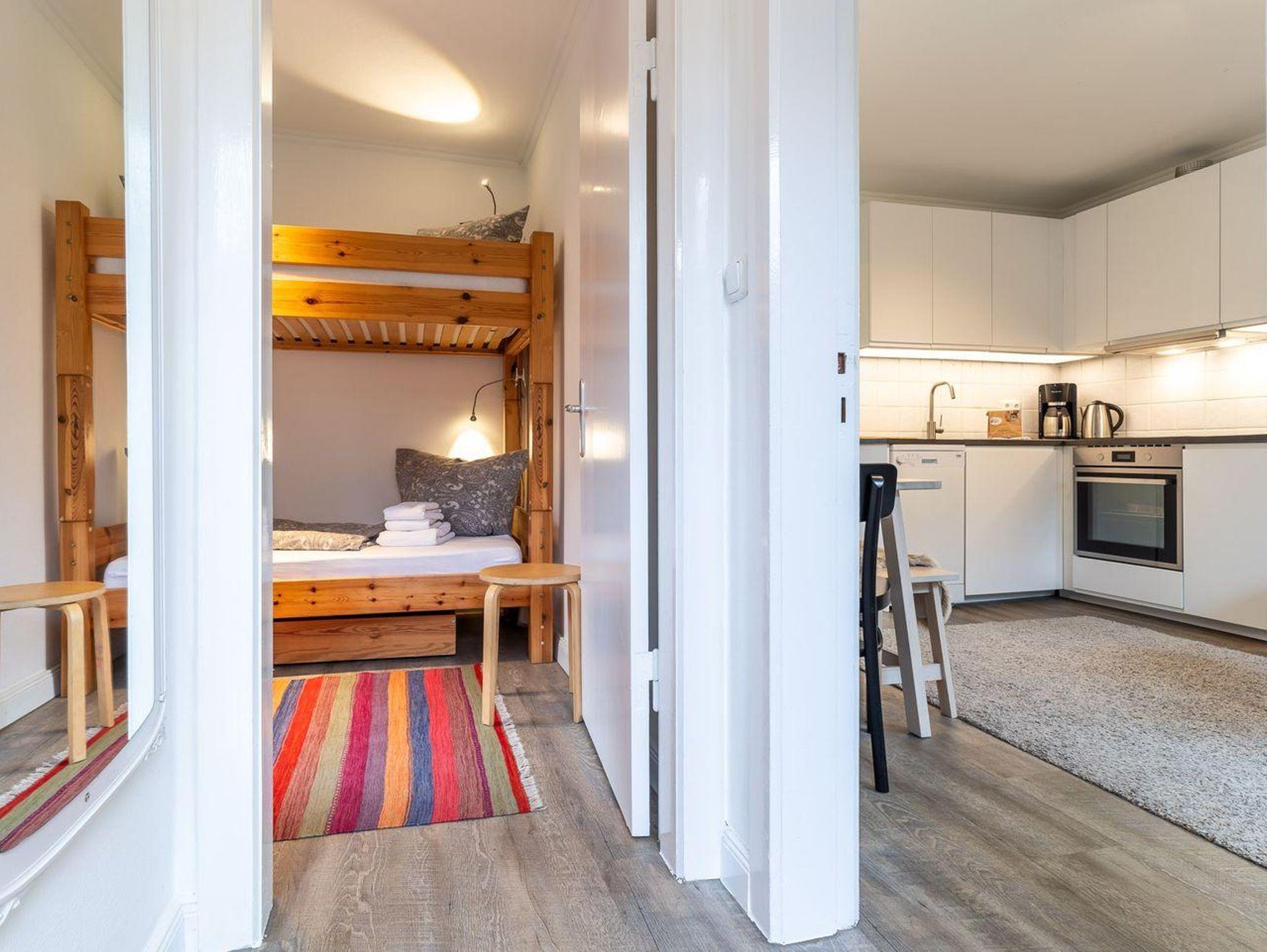 Das kinderfreundliche Schlafzimmer ist mit einem Doppelstockbett und einer Kommode ausgestattet, ideal für junge Gäste.