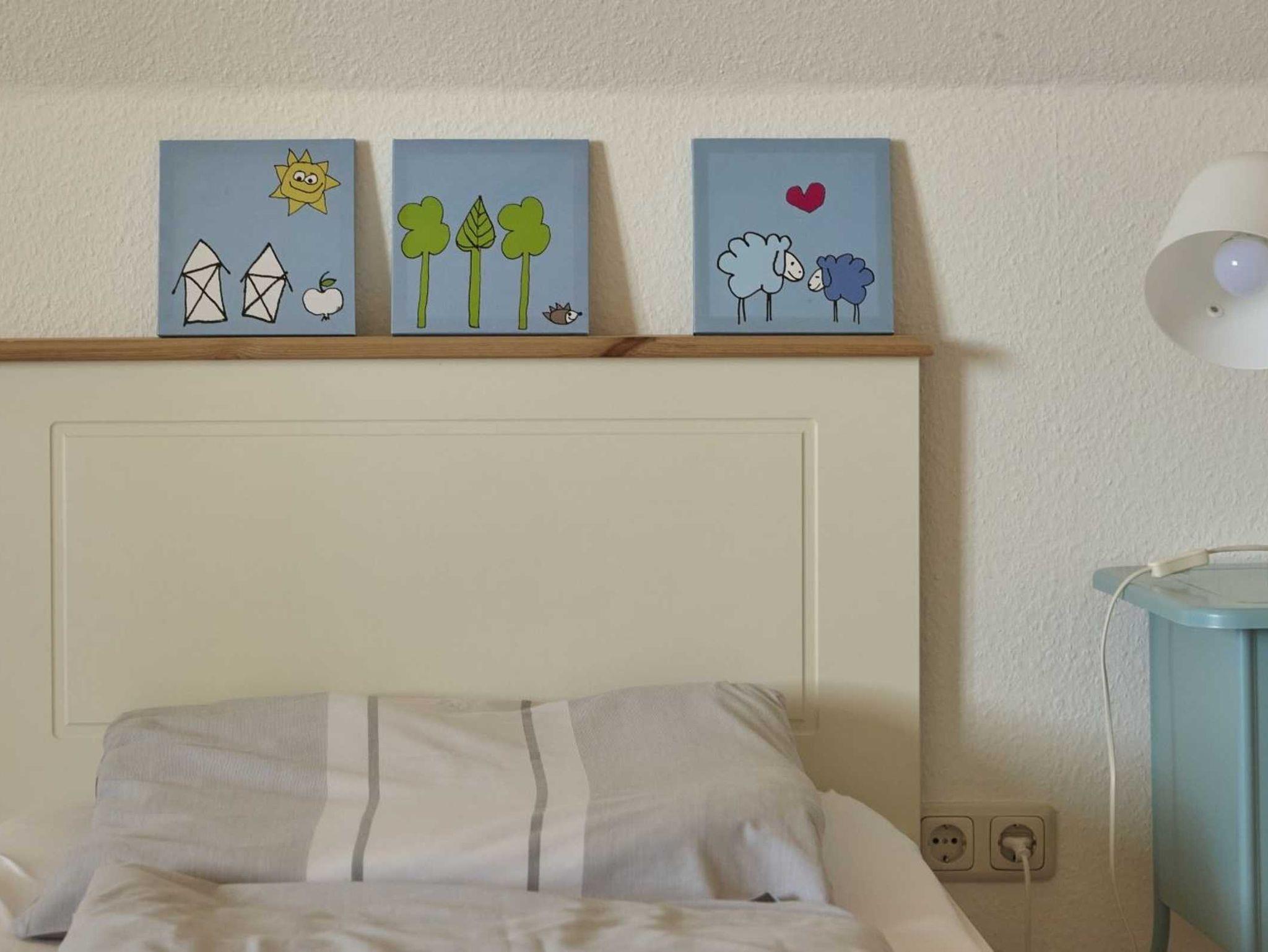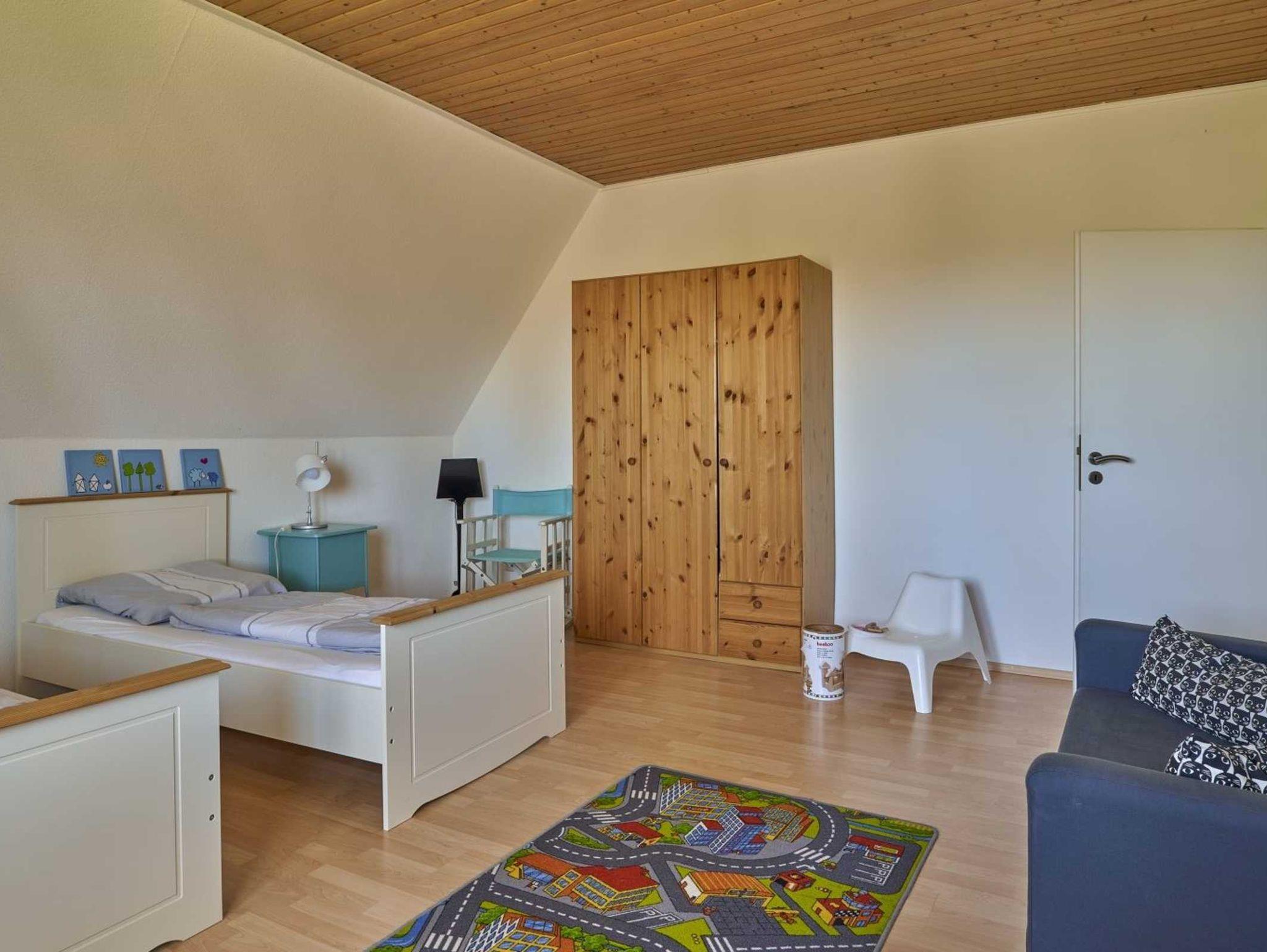 2. Schlafzimmer mit 3 Einzelbetten (je 90x200cm), Kleiderschrank und Tisch mit 2 Stühlen.