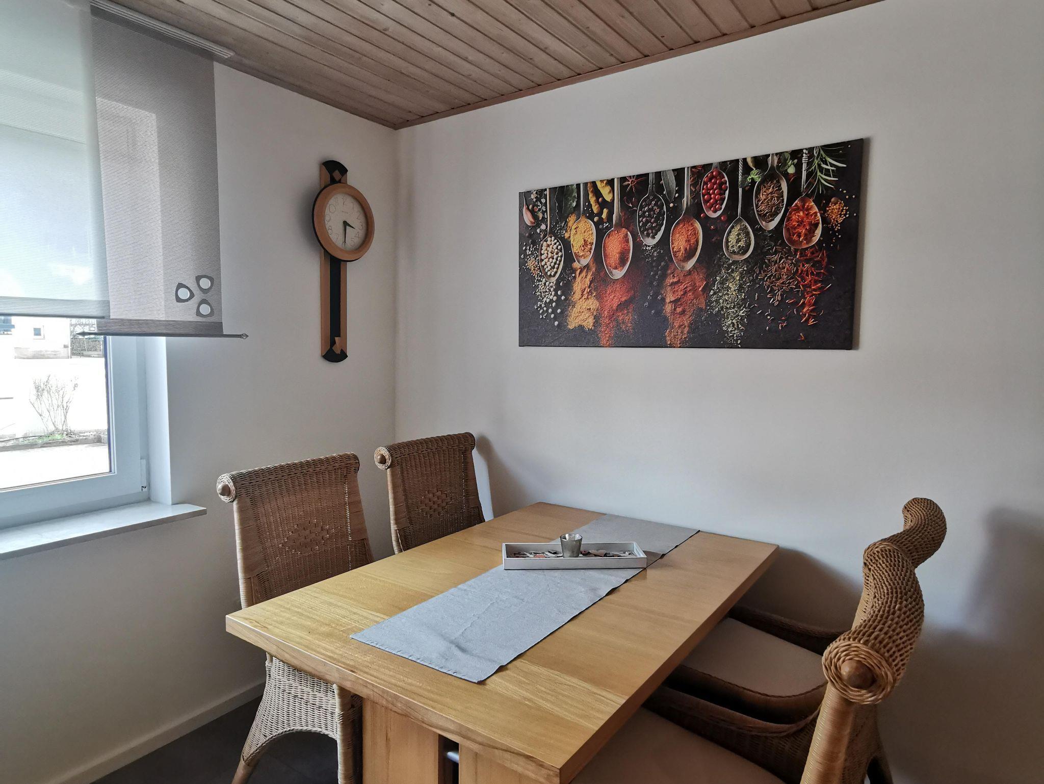 Unsere 70 qm² große Ferienwohnung befindet sich im Erdgeschoß des Hauses und liegt zentral in der Ortsmitte. In den Jahren 2020 und 2021 wurden einige Modernisierungsmaßnahmen durchgeführt. Die Wohnung besteht aus einer zum Flur hin offenen Küche mit Essbereich, einem Schlafzimmer mit Doppelbett, einem großen Wohn- und Essbereich sowie einem Bad mit begehbarer Dusche.-