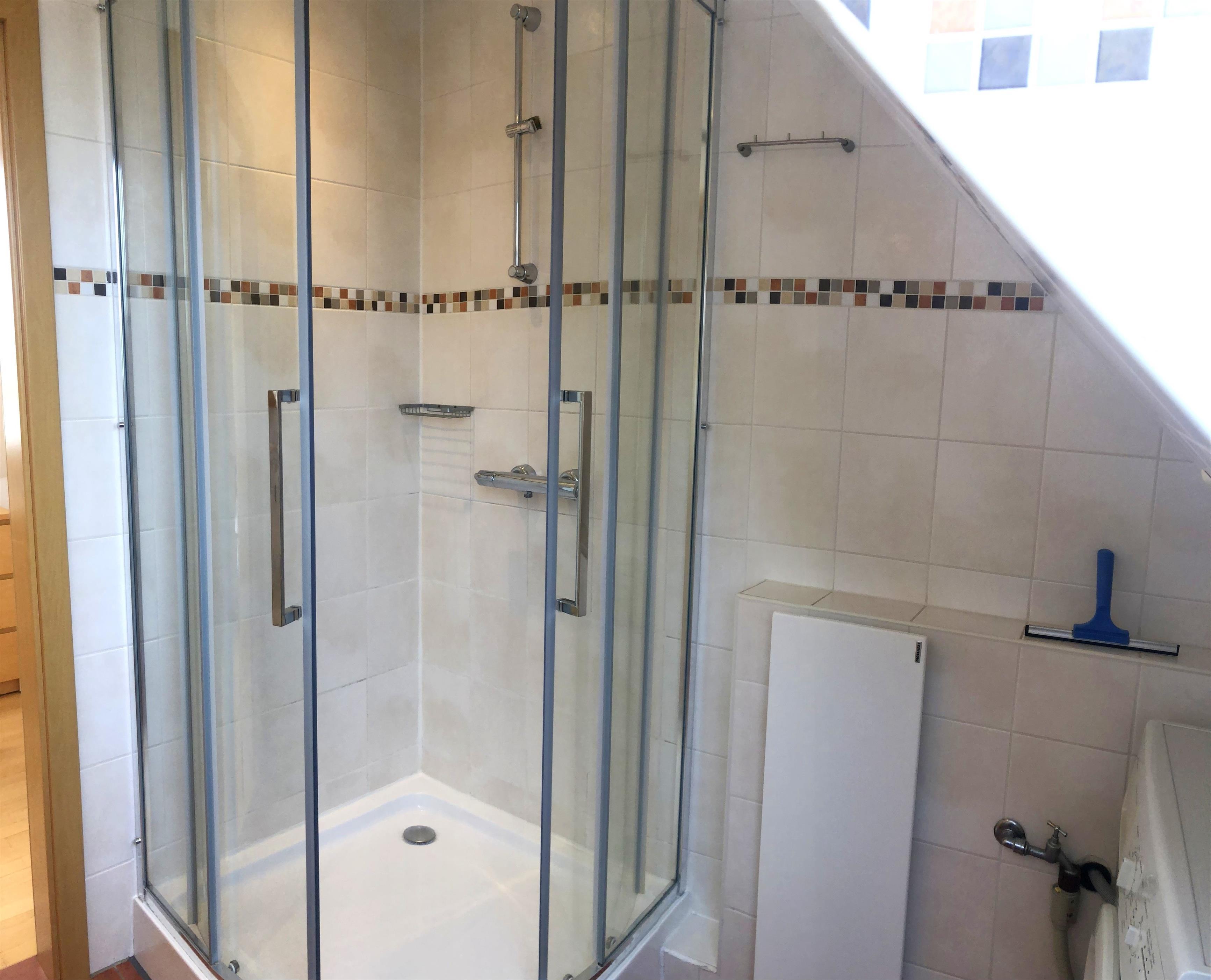 Oben warten zwei Schlafzimmer – eins mit Doppelbett, das andere mit zwei Einzelbetten – und außerdem ein zweites Bad mit Dusche und einer Waschmaschine.