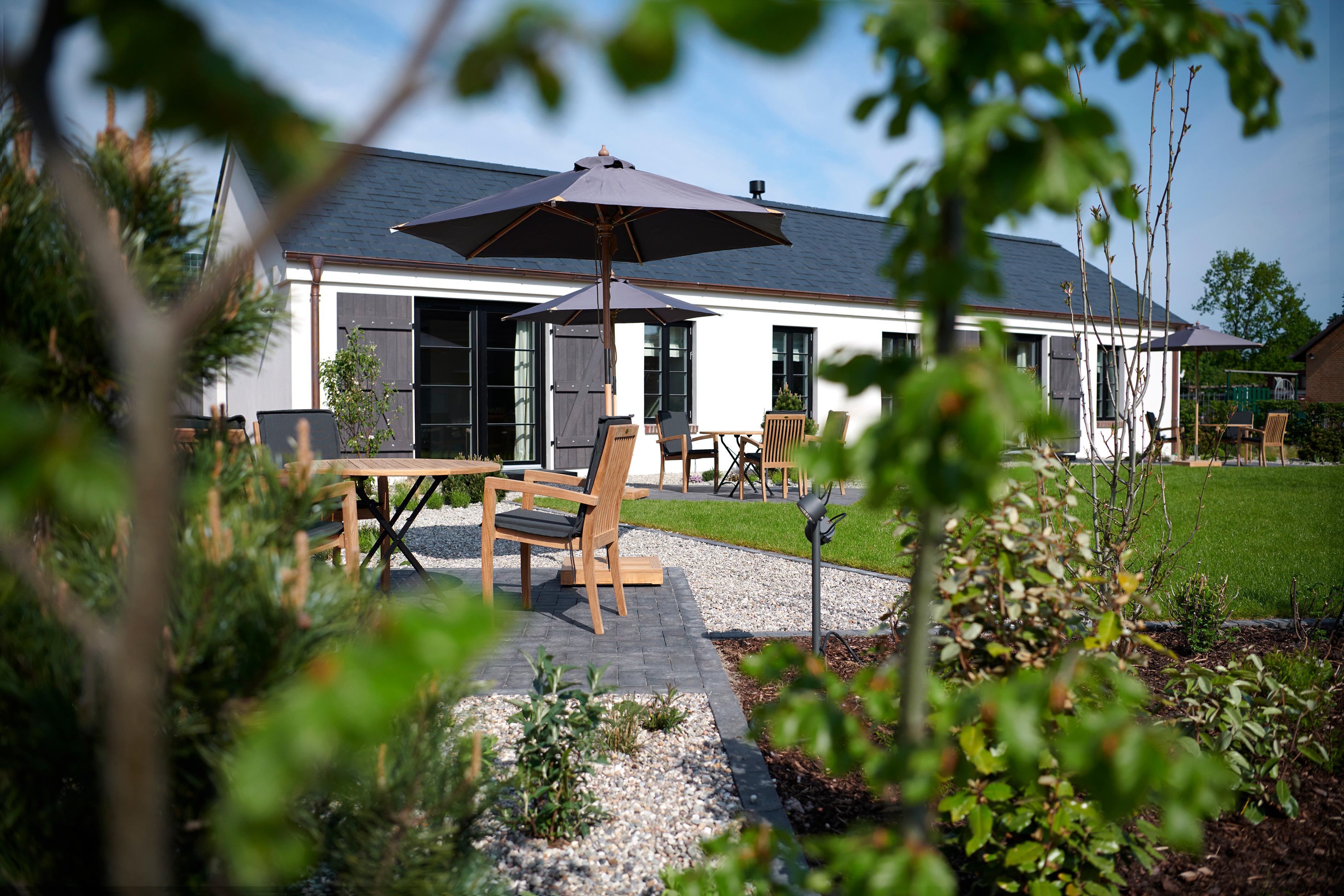 Neben der eigenen kleinen Terrasse steht Ihnen zusätzlich die große Grünfläche direkt am Haus zur Verfügung. Dort finden Sie auch die Sauna sowie eine Innen- und Außendusche.