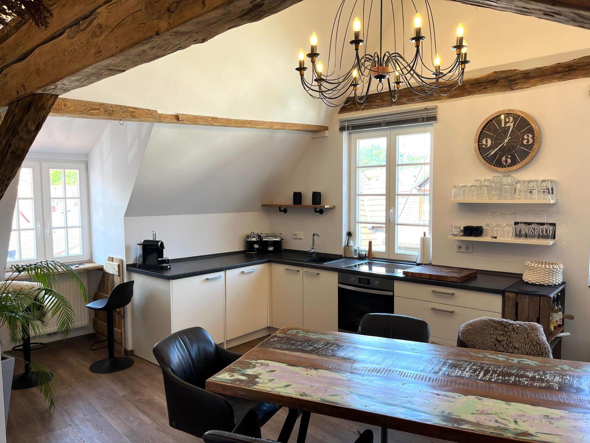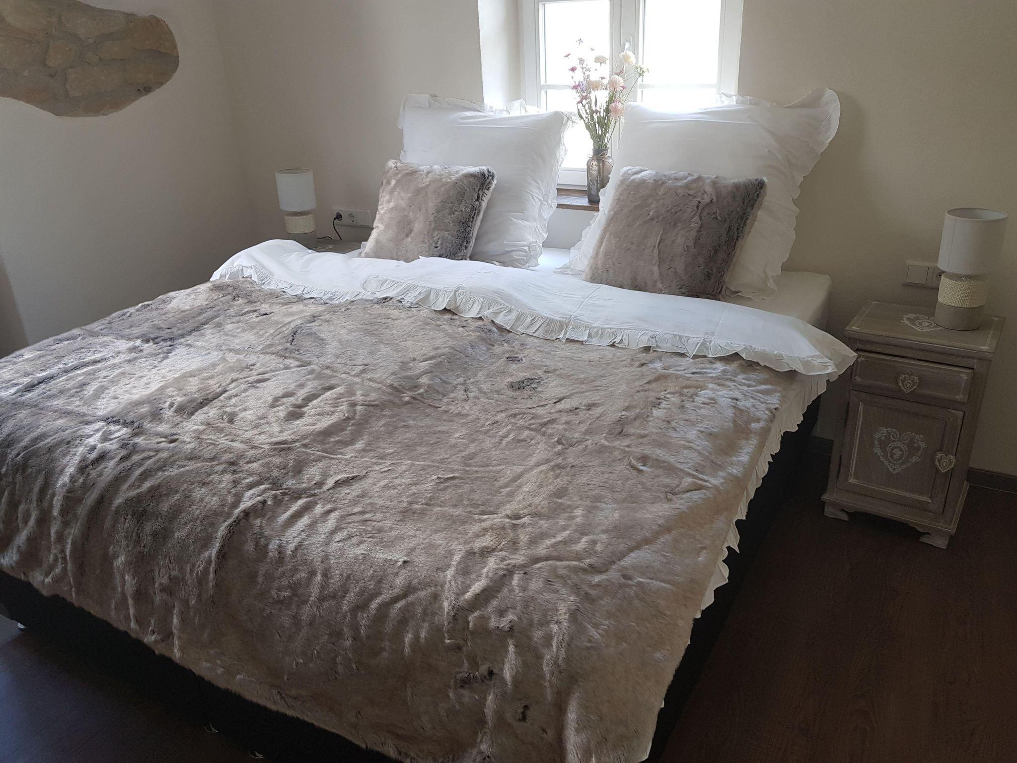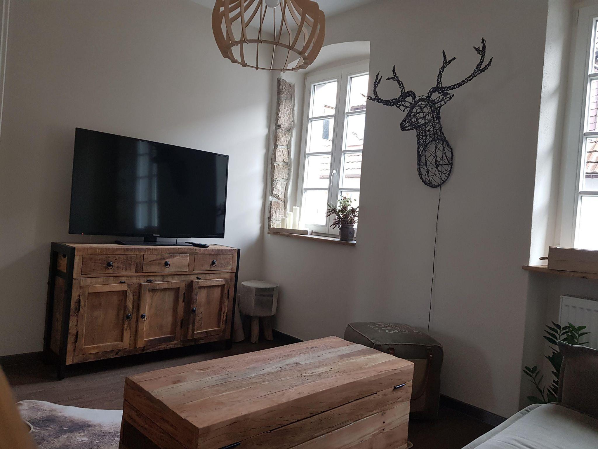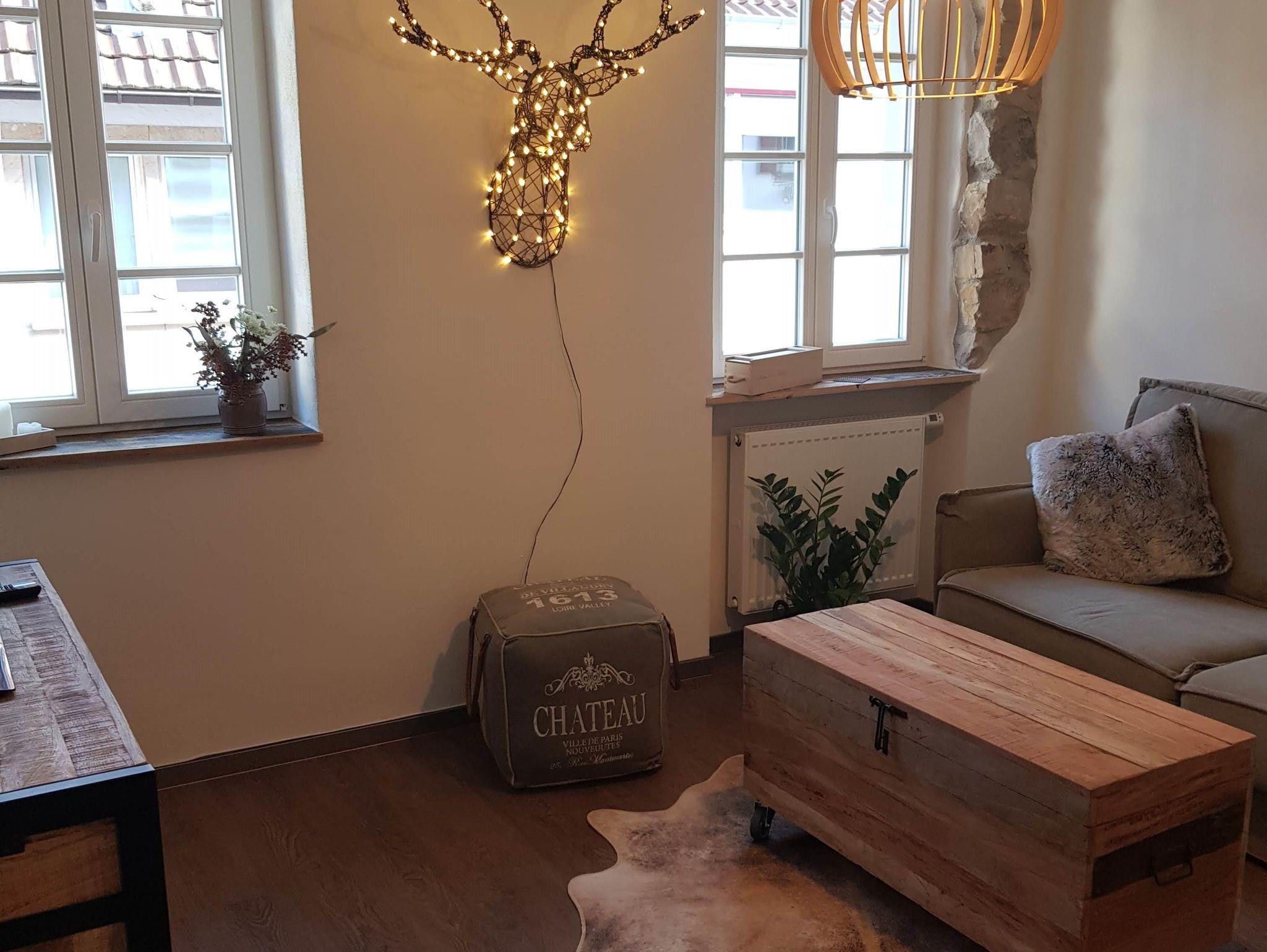 Unsere „Almhütte“ im 1. Obergeschoss, ausgestattet mit Naturmöbeln lädt zum Verweilen ein. Auf 43 qm erwartet Sie eine offene Küche mit Essbereich, ein Badezimmer mit Natursteinwaschbecken, ein Schlafzimmer mit einem großen Boxspringbett und ein Wohnzimmer mit komfortablem Schlafsofa. Innenhof lädt mit einer Sitzgelegenheit zum gemütlichen Beisammensein ein. Außerdem befindet sich dort ein PKW Stellplatz sowie die Möglichkeit Fahrräder unterzustellen. Im Keller steht eine Waschmaschine sowie ein Trockner zur gemeinschaftlichen Nutzung zur Verfügung. Handtücher, Bettwäsche und Endreinigung sind im Preis inklusive.
