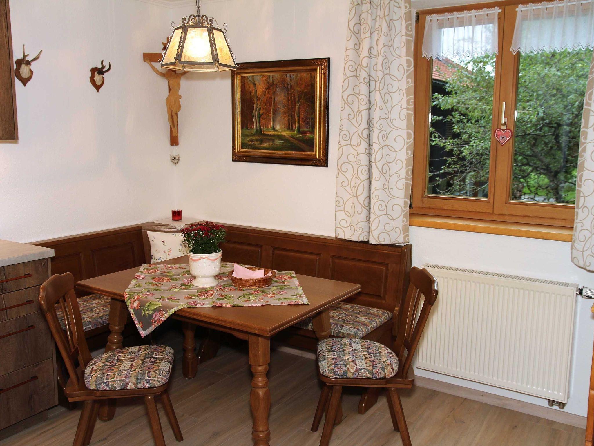 Die Ferienwohnung befindet sich im Nebengebäude, Hochparterre mit Terrasse und über eine Aussentreppe erreichbar. Urig, geschmackvoll eingerichtete Räume in gemütlicher Atmosphäre, in alpenländlichem Design. Wohnküche komplett ausgestattet, Schlafzimmer mit guten Matratzen und Bad mit reichlich Handtüchern.
