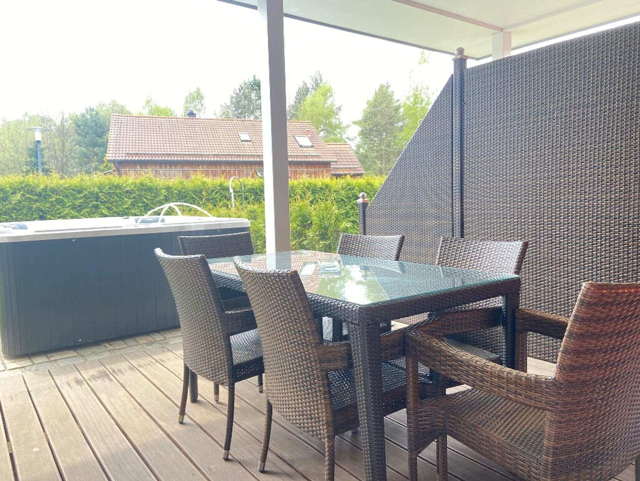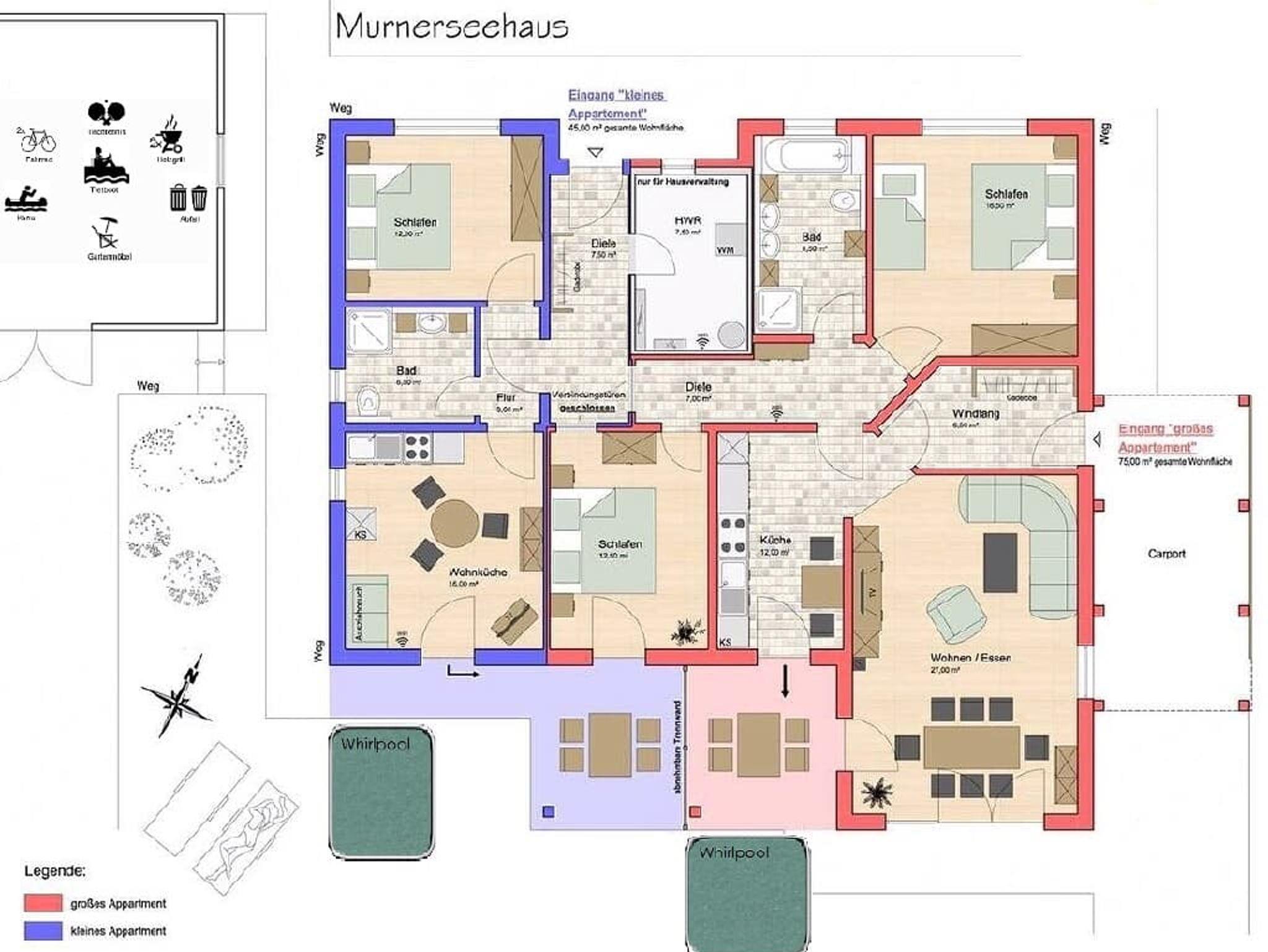 Zwei Bungalows nebeneinander, hier der große Winkelbungalow, genannt: Murnerseehaus ist unterteilt in großes und kleines Appartement mit zwei Hauseingängen. Die gute Raumaufteilung ermöglicht dennoch für 5 Personen Platz: 5 Betten und eine zusätzliche Schlafmöglichkeit im WZ (auf Anfrage).Der Whirlpool vor der Terasse kann gegen einen Aufpreis dazugebucht werden.