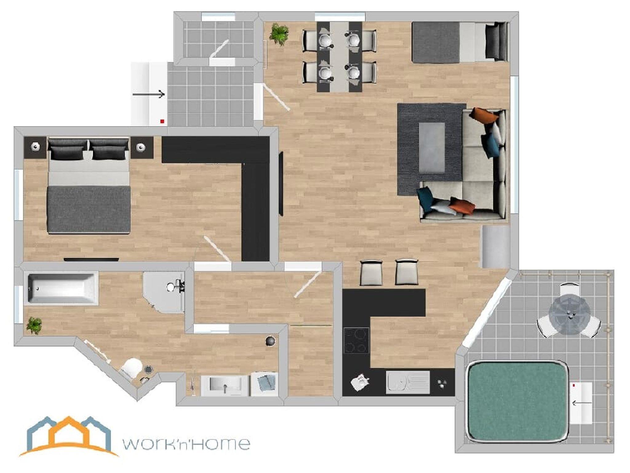 Das Badezimmer ist mit Dusche und einer Badewanne ausgestattet. Der Balkon der Wohnung ist auf dem Titelbild mit einem Pfeil markiert. Auf dem Balkon steht ein Whirlpool, der gegen einen Aufpreis von 30,00 € pro Tag aber mindestens 90,00 € dazugebucht werden kann. Das WLAN ist kostenfrei nutzbar.