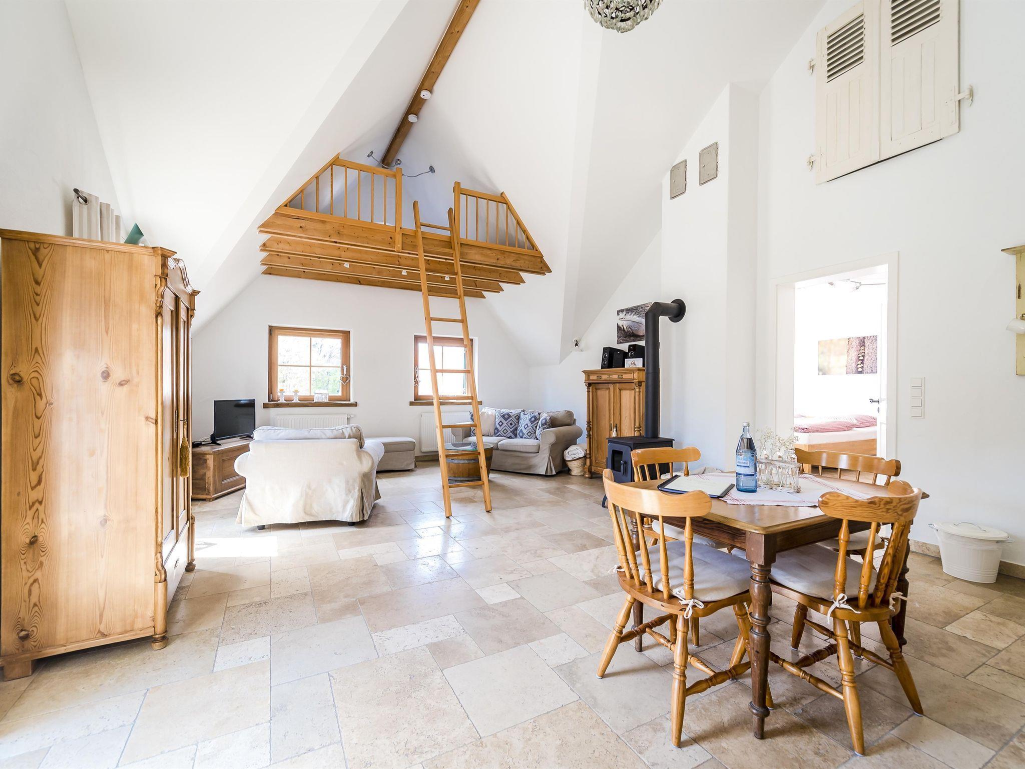Über die großzügige, möblierte Sonnenterrasse betreten Sie die ländlich-moderne Ferienwohnung im ersten Stock. Der Wohn-Essraum mit offener Küche im modernen Landhausstil wird Ihnen durch sein stilvolles Ambiente, die bis in den Dachstuhl offenen Decken und die Wohlfühlempore ein einzigartiges Wohngefühl vermitteln. Blicken Sie aus allen Fenstern ins Grüne und auf unseren wunderschön sanierten Innenhof!