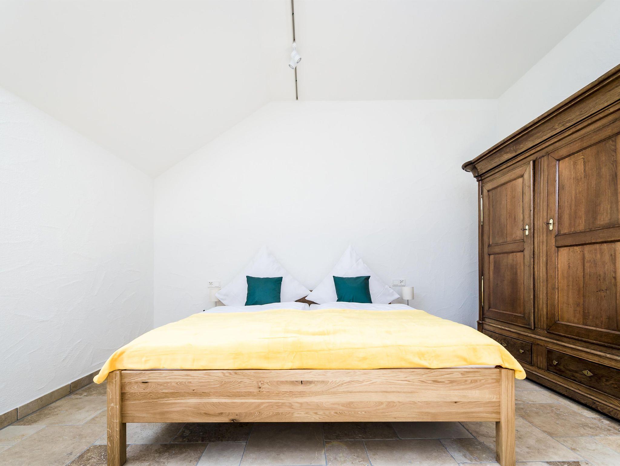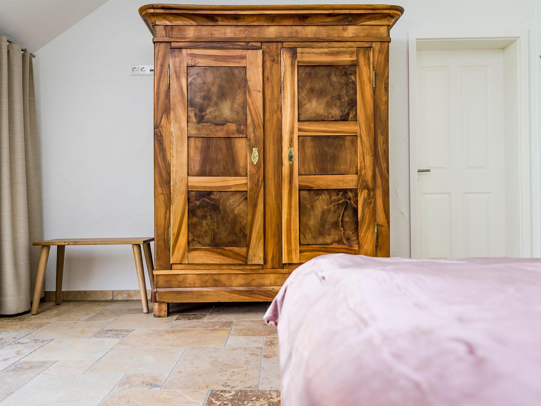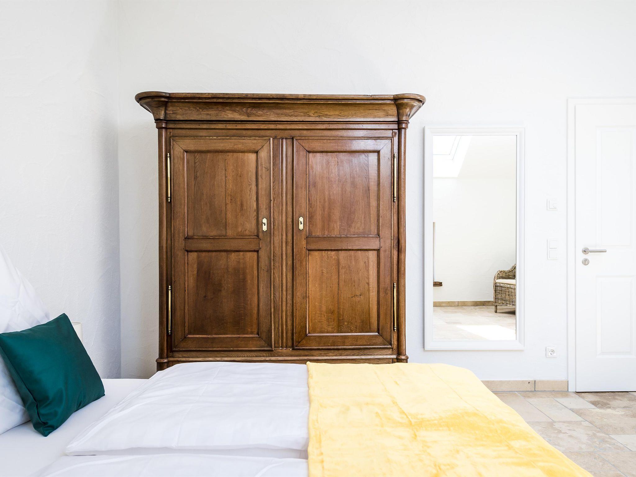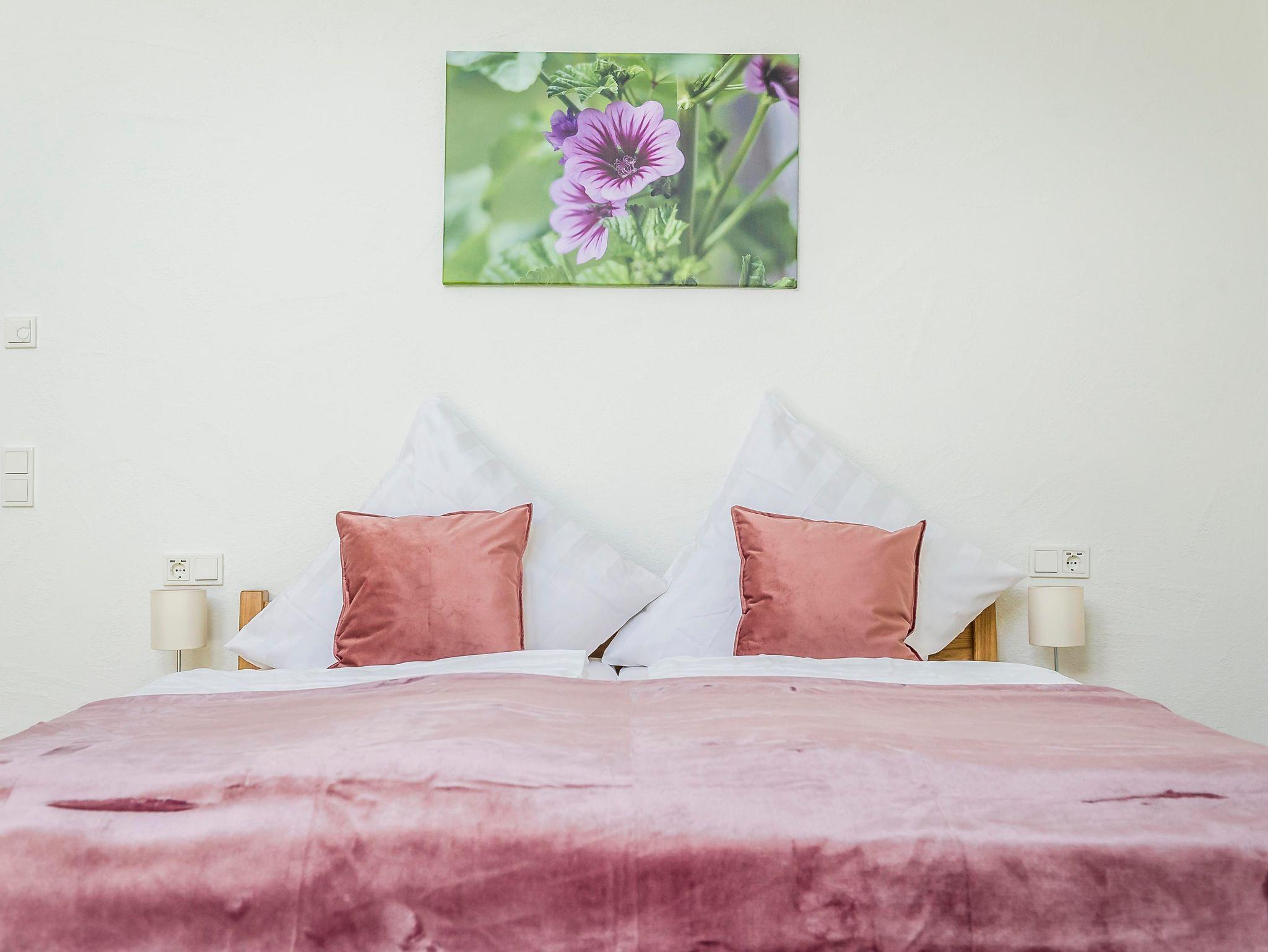 Unsere vier Doppelzimmer Ringelblume, Narzisse, Malve und Gänseblümchen sind ausgestattet mit einem modernen Doppelbett mit Kaltschaummatratzen. Sitzgelegenheit, große antiker Schrank und kleiner Schreibtisch komplettieren die Einrichtung.
