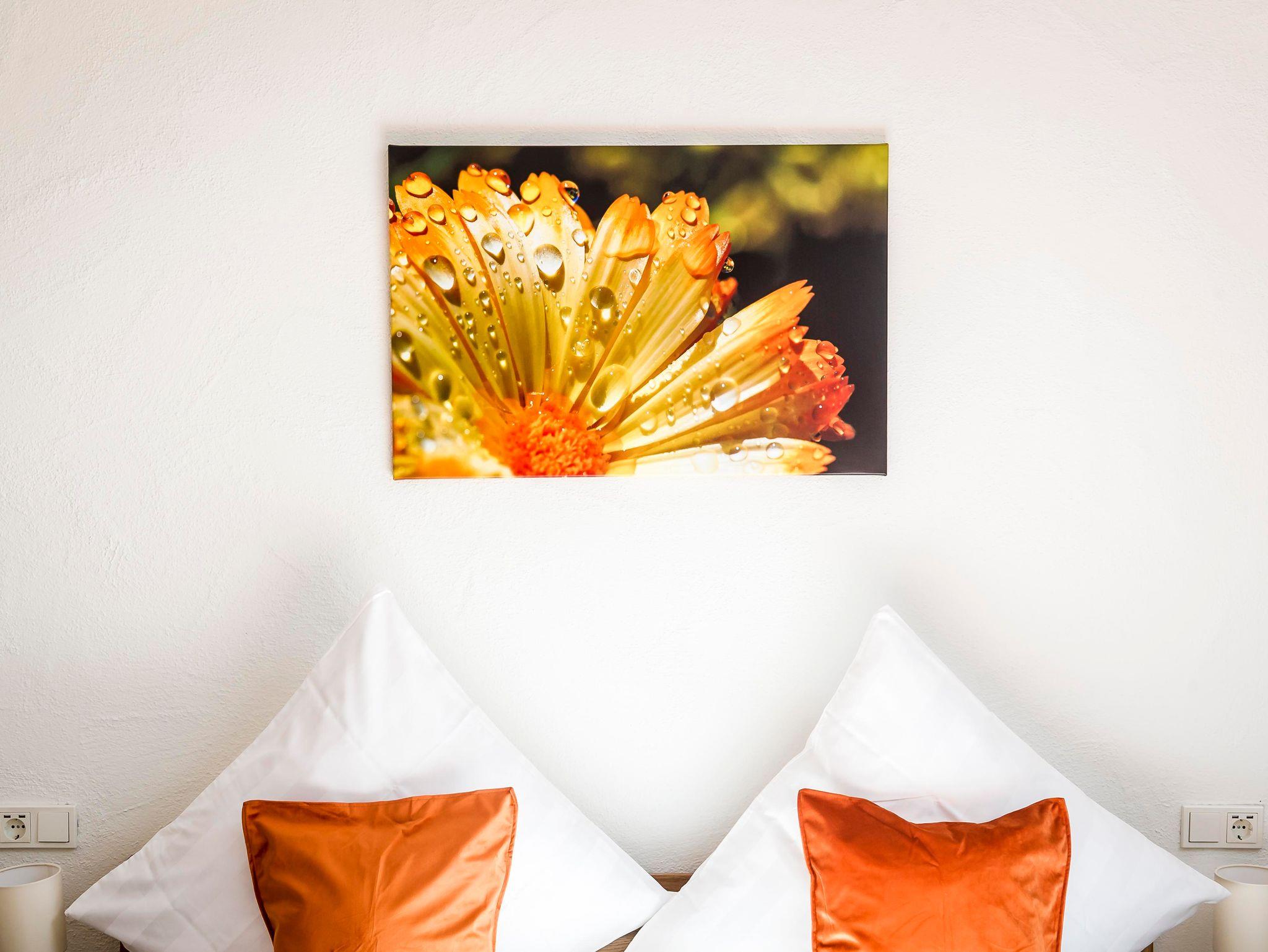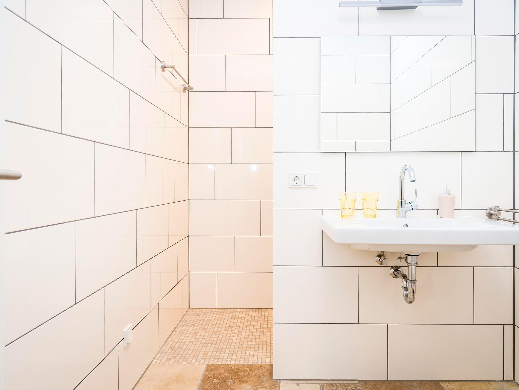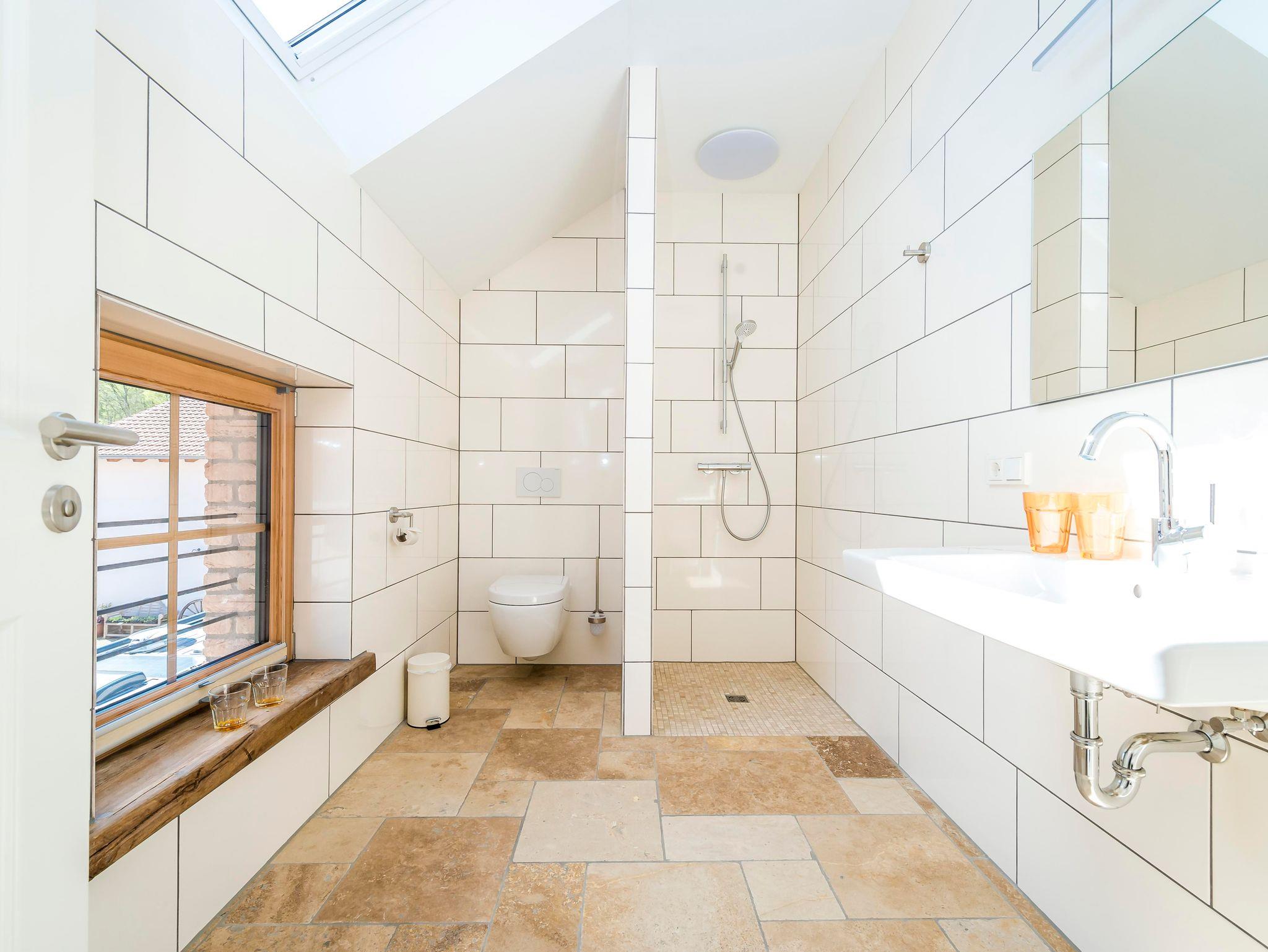 Die Großzügigkeit des Raumes und das helle Bad mit bodenebener Dusche tragen zum Wohlgefühl genauso bei wie die jeweiligen Farbakzente, die als Thema die heimischen Blumen aufgreifen.