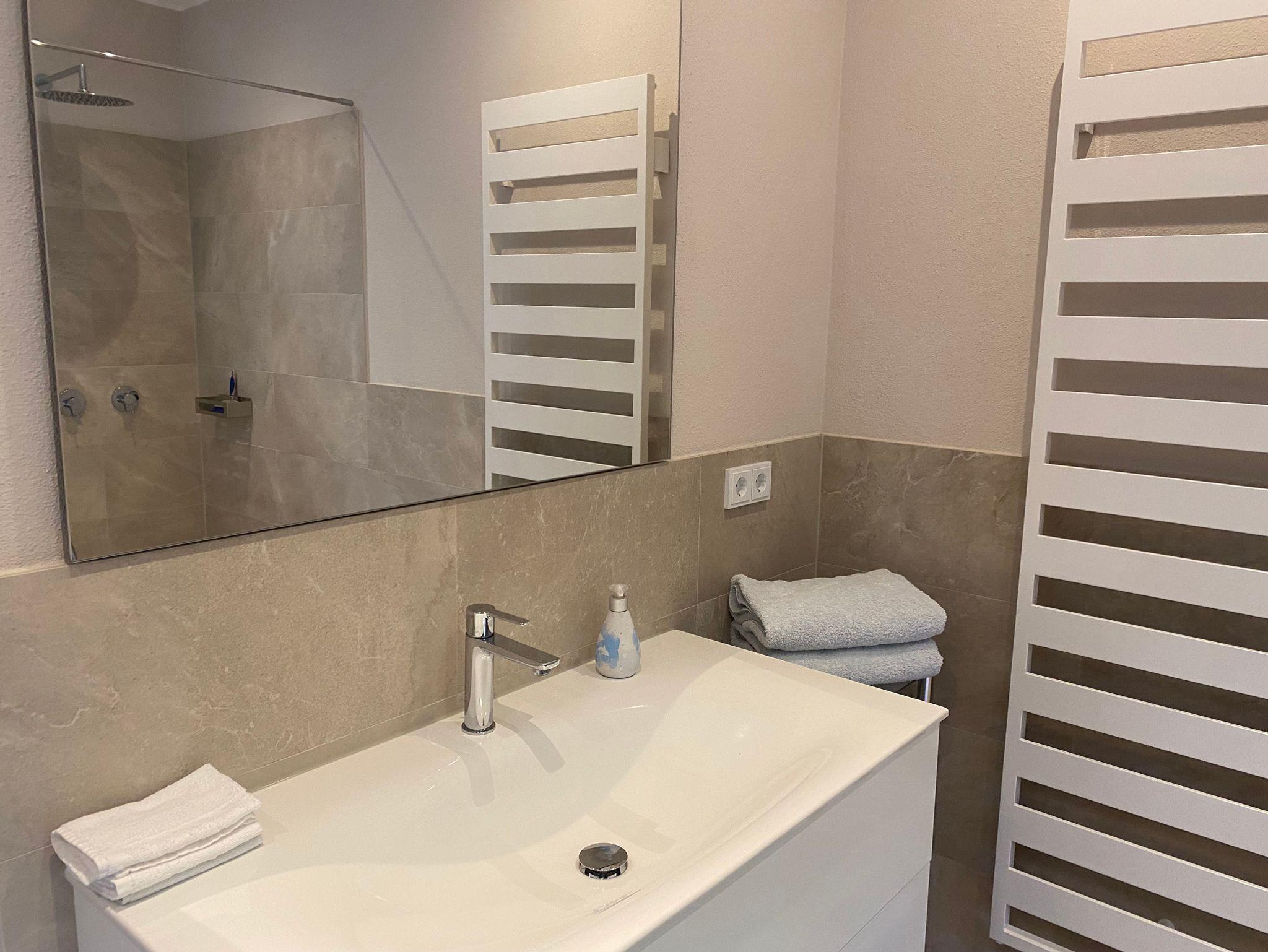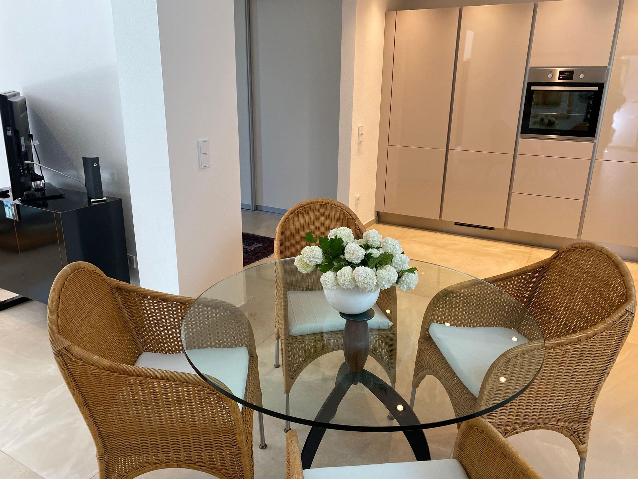 Hochwertig ausgestattete Ferienwohnung für 2 Personen, die Wohnung liegt im Erdgeschoss und ist 90 m² groß und behindertenfreundlich, weil sie ebenerdig liegt und keinerlei Schwellen verbaut sind. Sie verfügt über ein Schlafzimmer mit Flachbild-TV, ein großzügiges Badezimmer mit Rainshower-Dusche und Handtuchtrockner, einen großen offenen Wohnraum mit komplett ausgestatteter Küchenzeile, einen Esstisch, eine Leseecke, eine gemütliche Wohnlandschaft mit Flachbild-TV und eine Terrasse mit Gartenmöbeln und Liege.