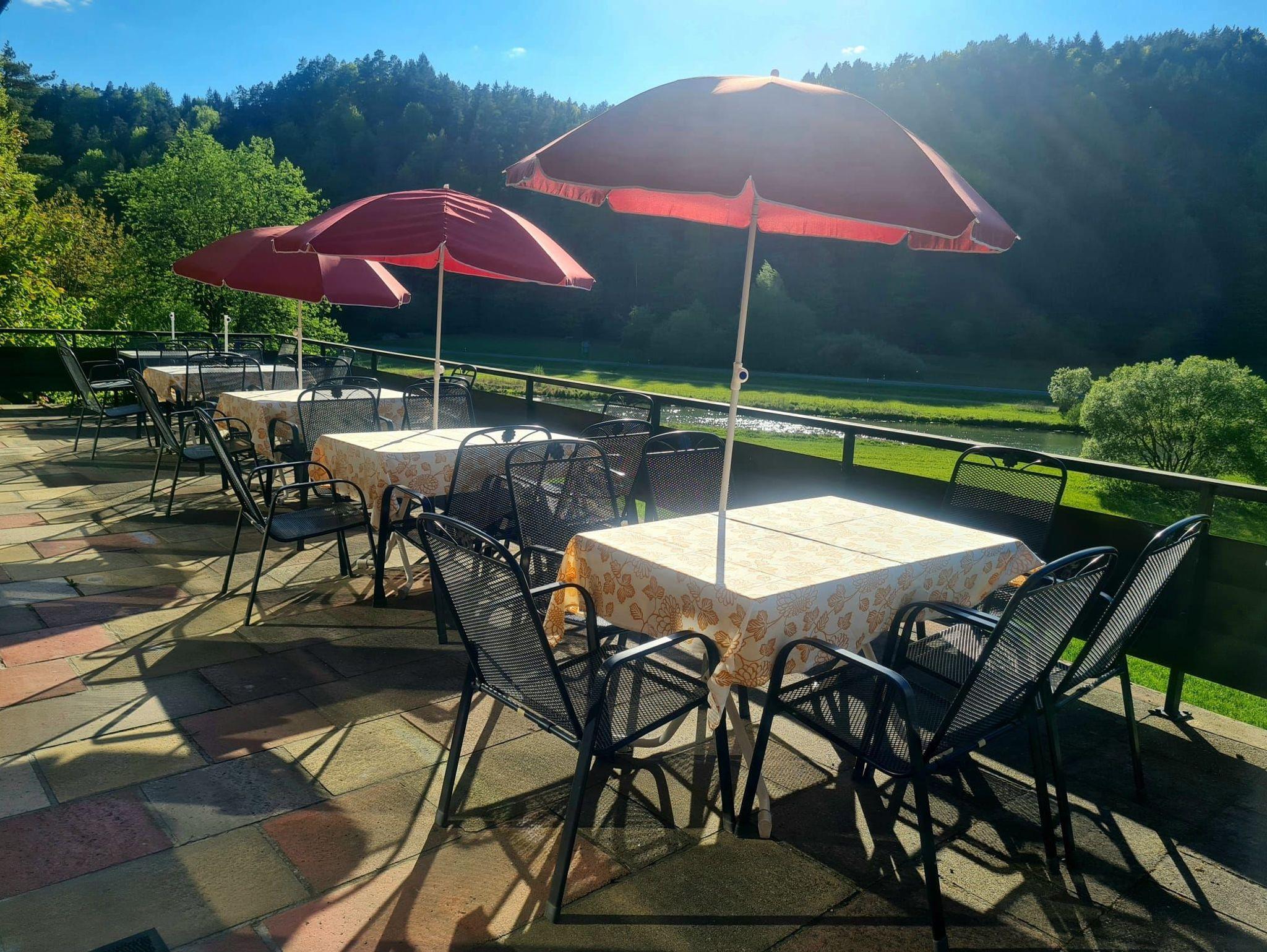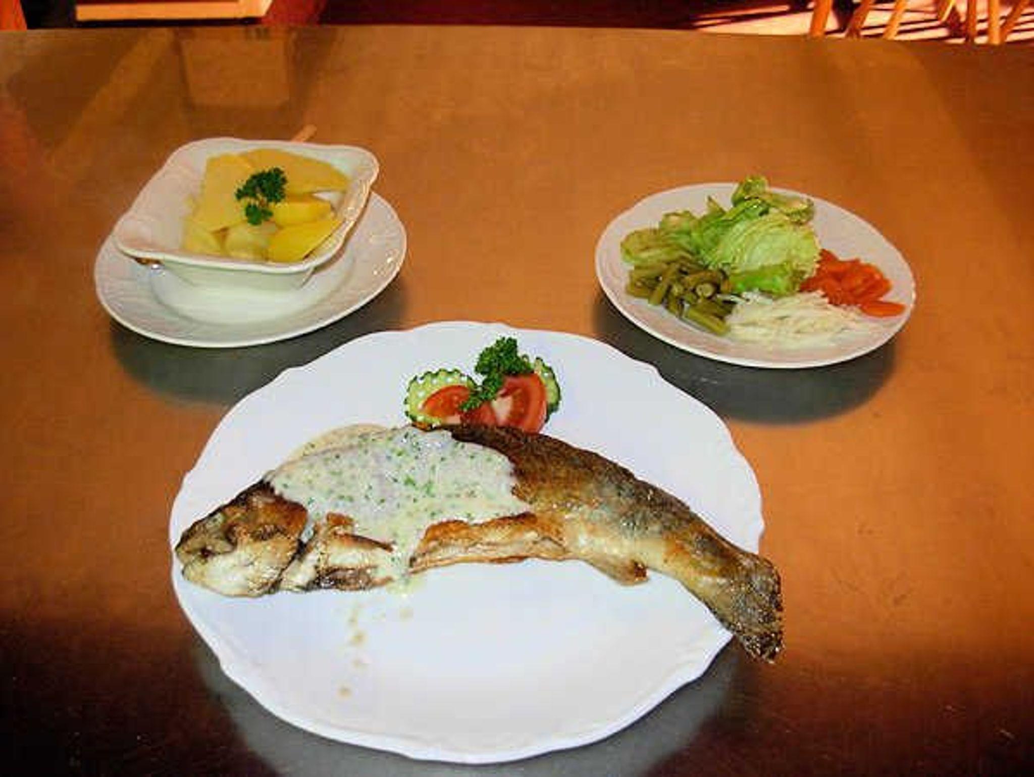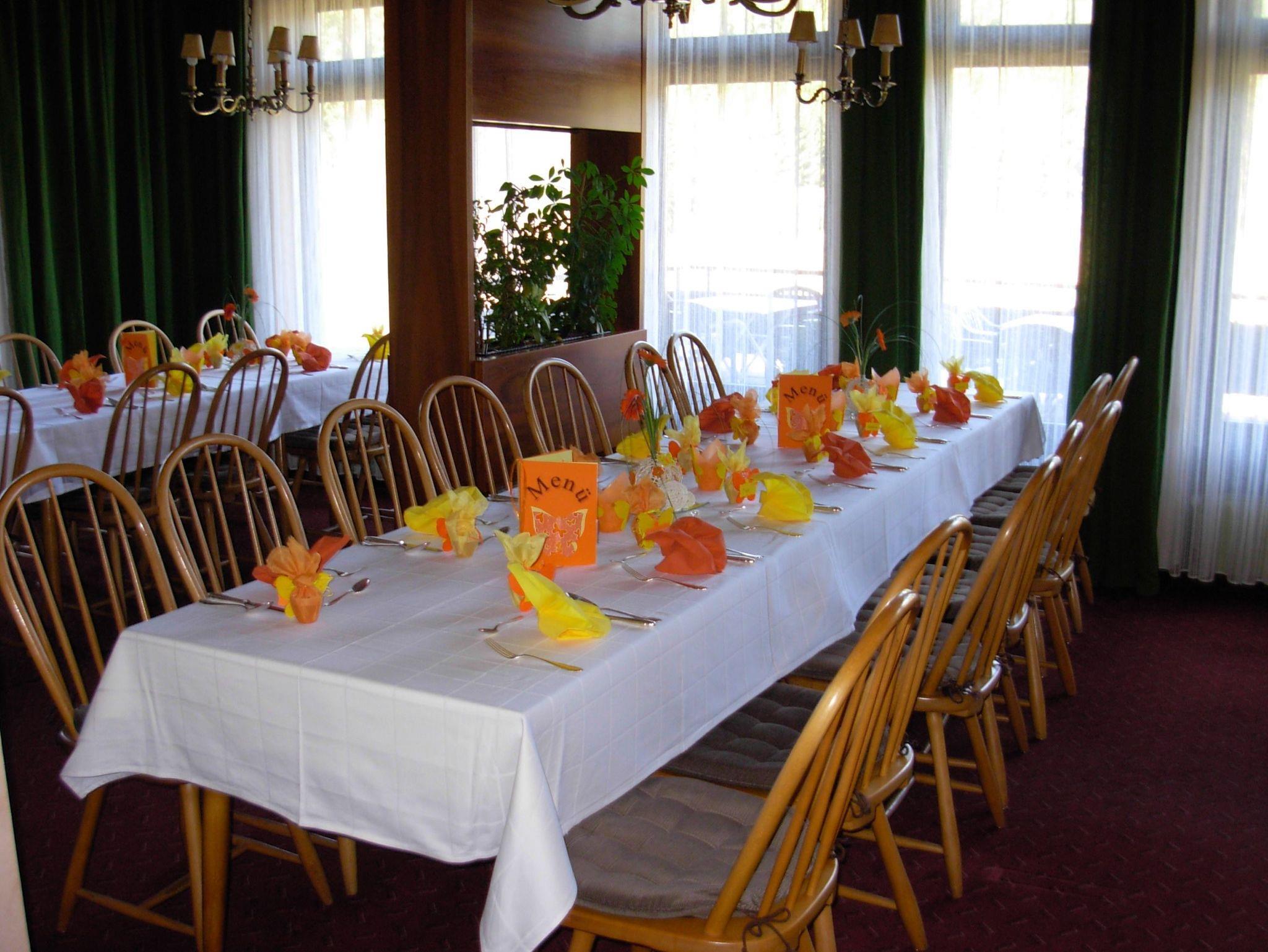Im Parterre befindet sich das Restaurant. Hier können Sie zu jeder Tageszeit eine entsprechende Mahlzeit einnehmen. Morgens bedienen Sie sich selbst am reichhaltigen Frühstücksbuffet, nachmittags können Sie auf unserer Sonnenterrasse frische Torten und Kuchen aus eigener Herstellung genießen und abends wählen Sie aus der Karte, die Speisen aus der guten fränkischen Küche, sowie fangfrische Forellen und Wildgerichte umfasst. In unserem Kaminzimmer finden Sie immer ein beschauliches Plätzchen in wohliger Atmosphäre. Eine Spielwiese für Kinder ist ebenfalls vorhanden genauso wie genügend Parkplätze direkt vor der Haustüre.