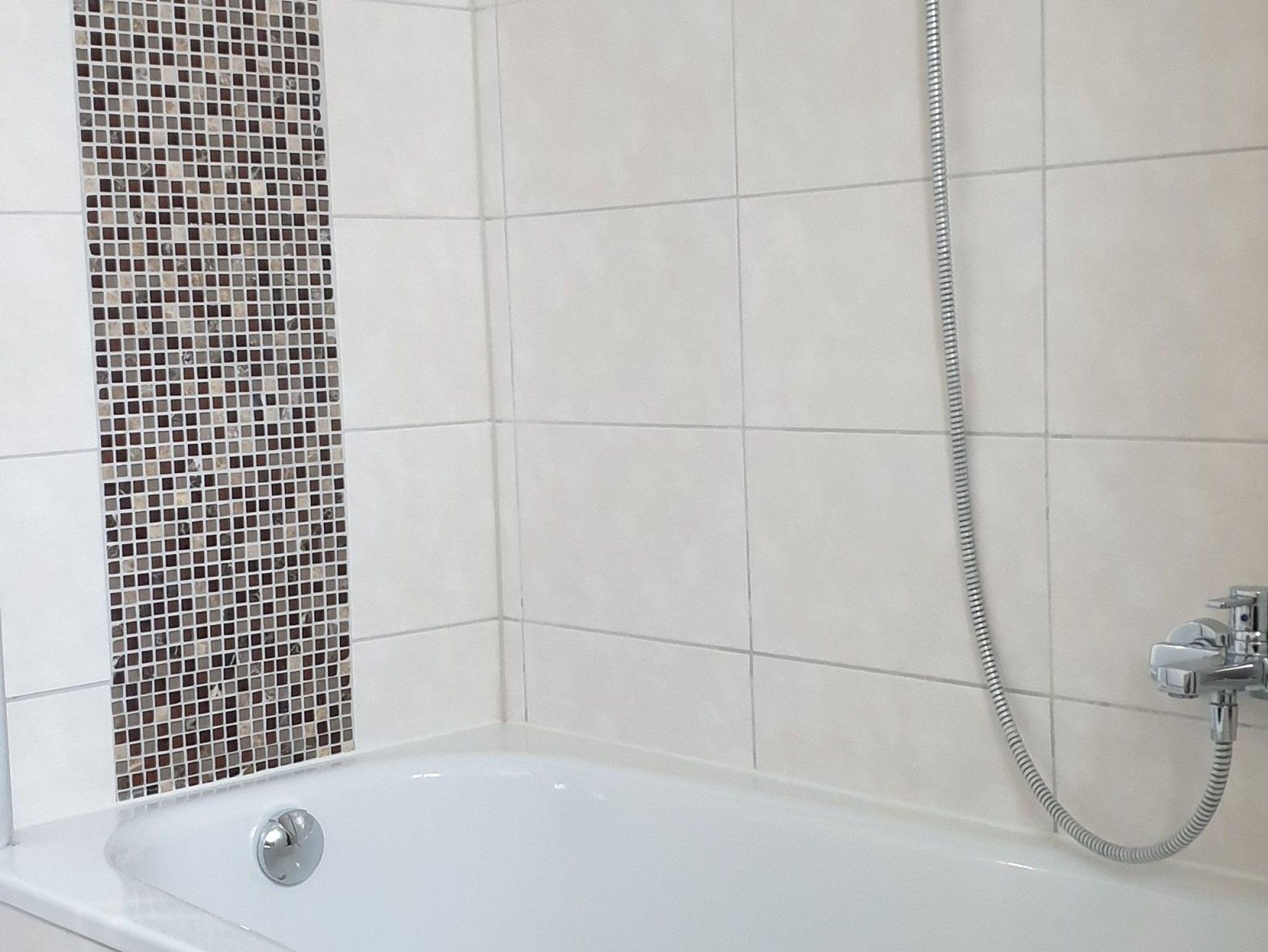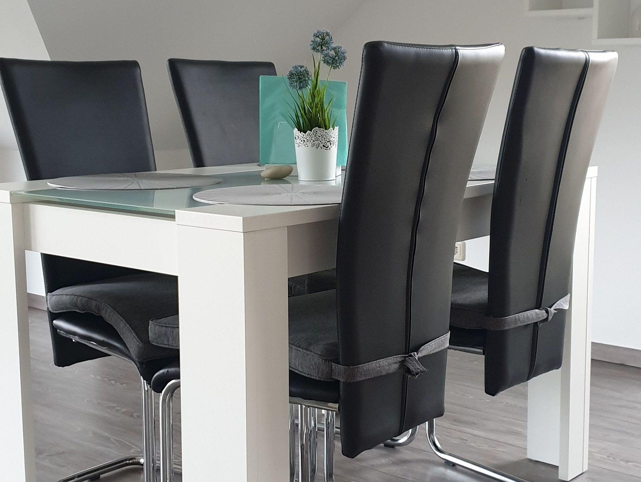 Der Esstisch hat Platz für 6 Personen. Die Küche ist vollausgestattet und hält für Sie eine Filterkaffeemaschine, Toaster, Wasserkocher, Mikrowelle, Ofen und einen Herd bereit. Über den Flur rechts erreichen Sie das Bad, mit Duschwanne und eigenem Waschmaschine/Trockner Turm. Ein Hocker für die Kinder, zum leichteren Erreichen des Waschbeckens, ist hier ebenso selbstverständlich, wie ein Kinderaufsatz für die Toilette.