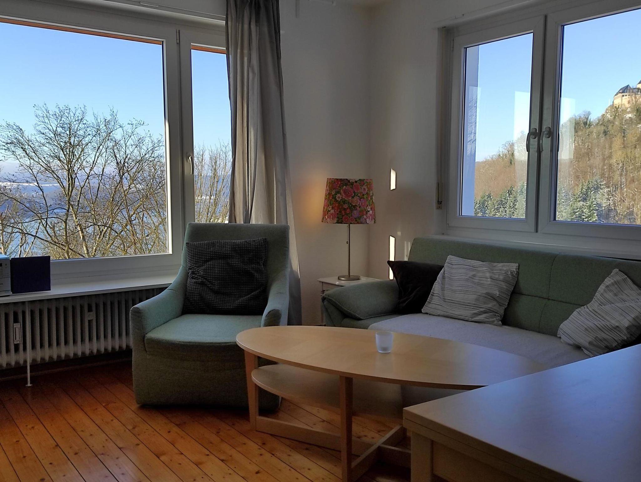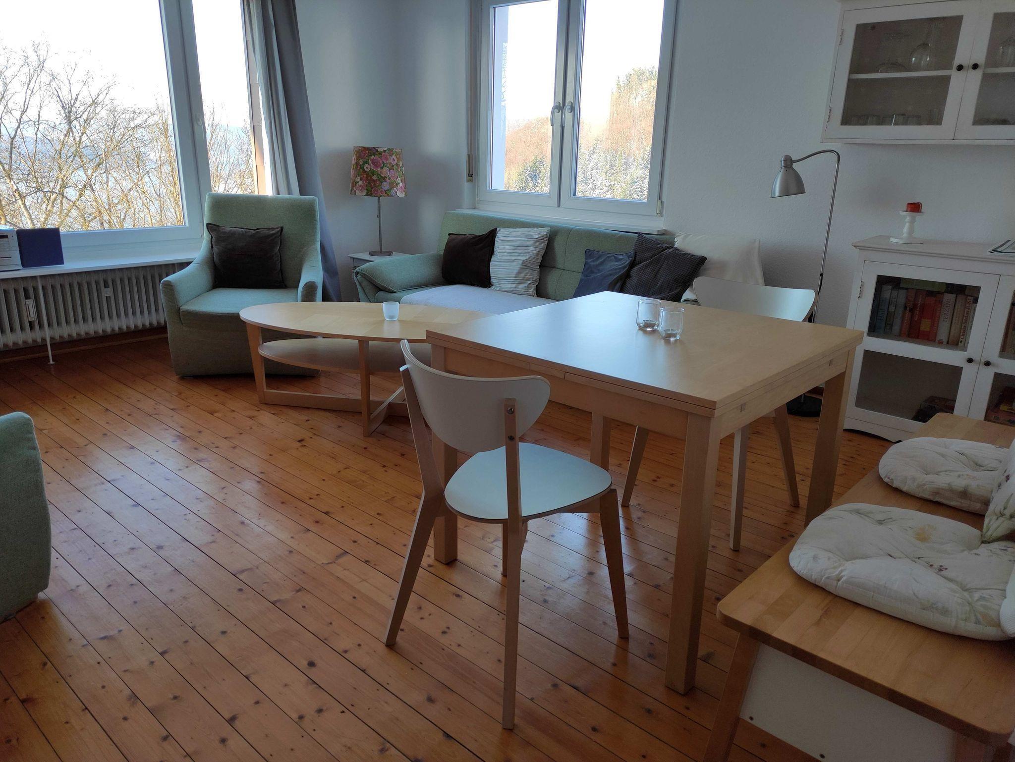 Die Wohnung Sonnenröschen liegt im ersten Obergeschoss. Im großen Wohn- und Esszimmer genießen Sie durch die Fensterfront einen herrlichen Ausblick auf den Edersee und Schloss Waldeck. Die kleine Küche liegt gegenüber.