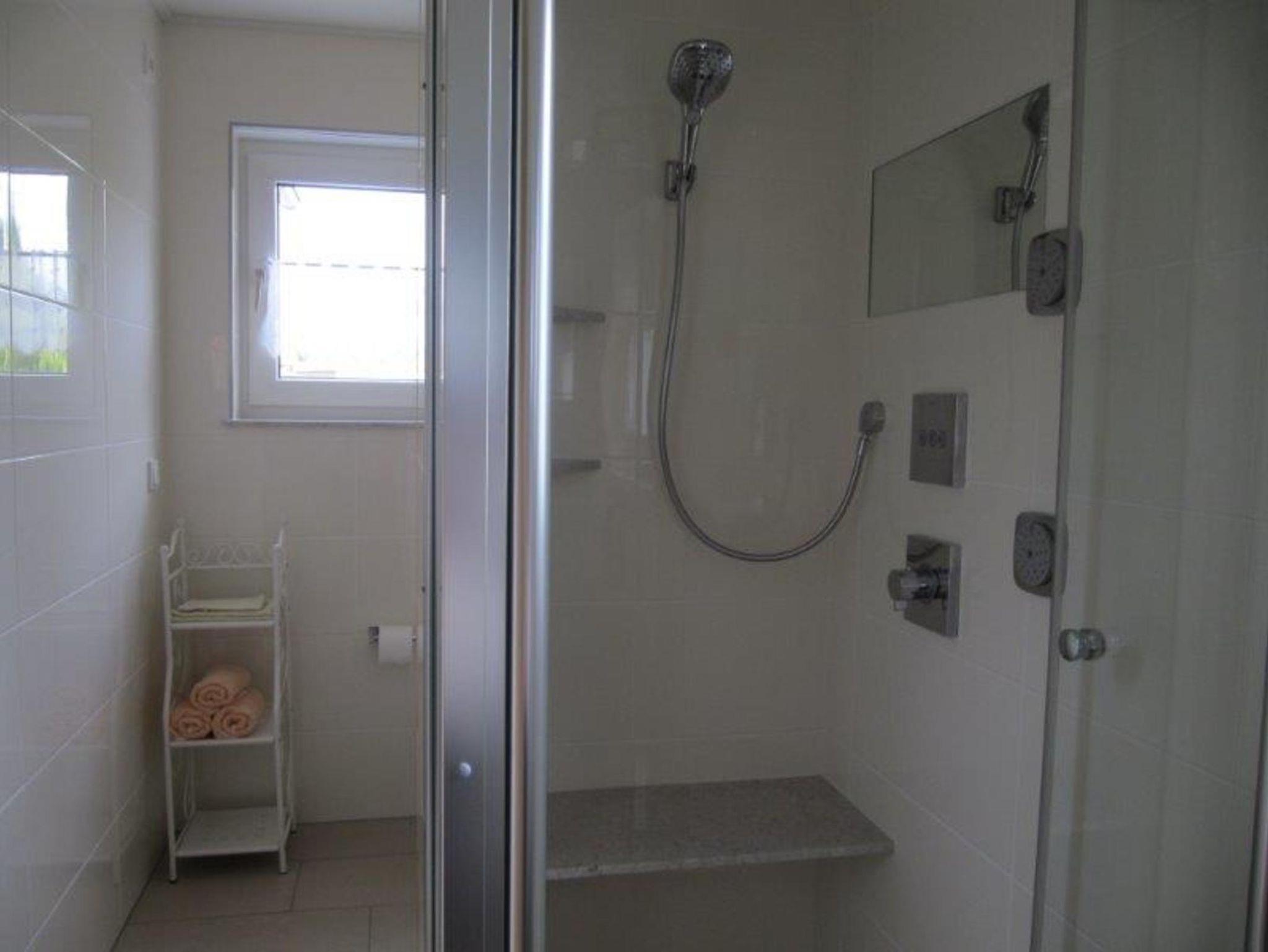 einmal mit komfortabler ebenerdigen Dusche, Raindance-Dusche, Handbrause, Massagedüsen, Waschtisch, Fön, Handtücher und WC