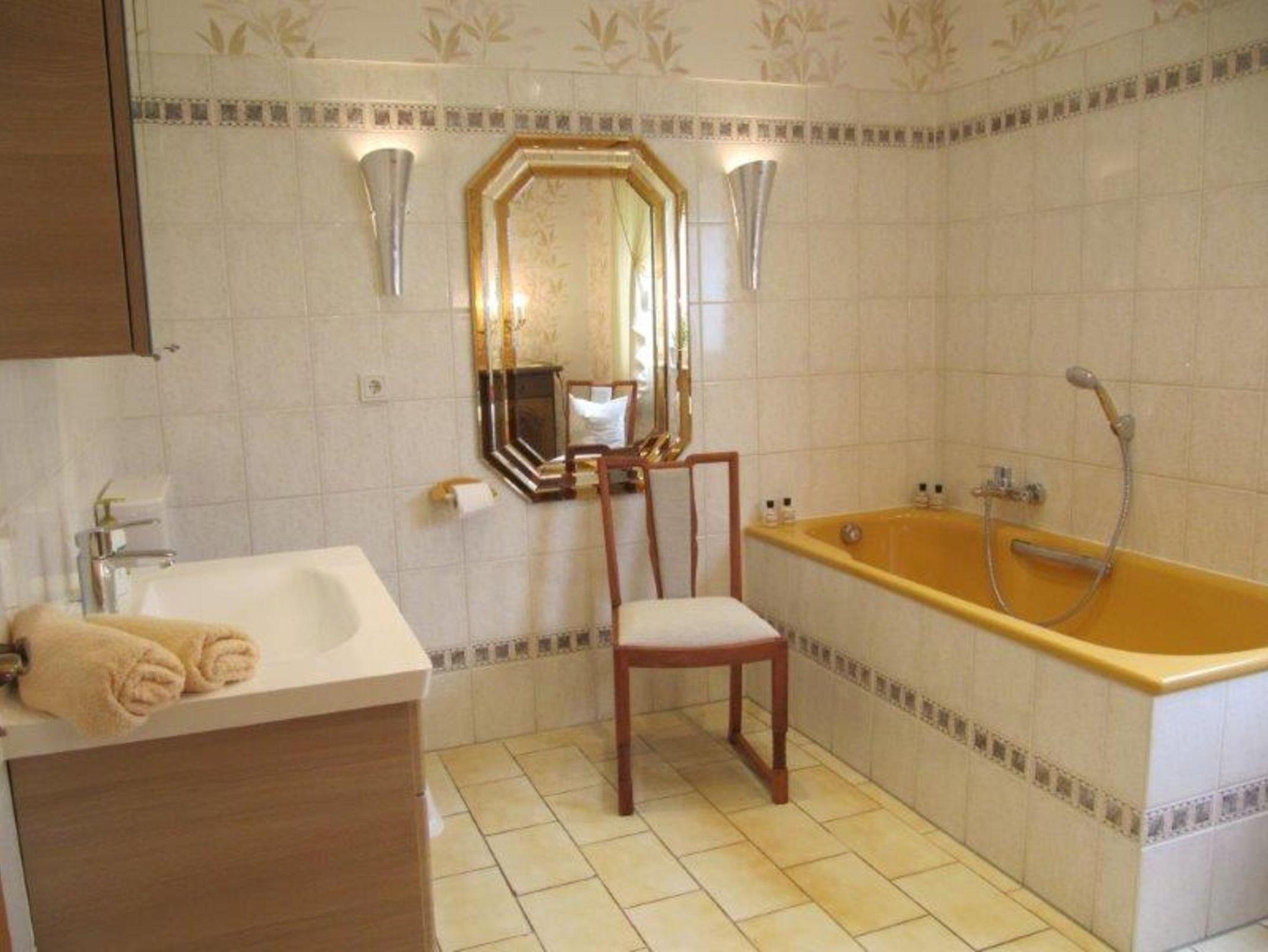 einmal mit Wanne, Waschtisch, Fön, Handtücher und WC