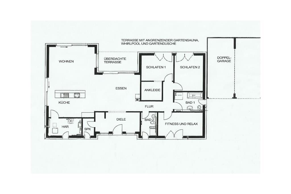 Ground floor: (Kitchen(Mixer, Spices, Tea Towels, hob, hob, electric kettle, toaster, coffee machine, oven, microwave, dishwasher, fridge, freezer, heating), Living/diningroom(Sofa, TV, dining table, fireplace, heating), bedroom(Bed Linen, Wardrobe, double bed, TV, heating), bedroom(Bed Linen, Wardrobe Coatrack, double bed, TV, heating), bathroom(Mirror, toilet, bath tub, shower, shower, washbasin, heating, hairdryer), bathroom(Mirror, toilet, shower, washbasin, heating), drying room(Vacuum Cleaner, tumble dryer, washing machine, ironing board, iron, drying cabinet), storage, lounge set(Exercise Room, heating)) Hot Water, Internet Access DSL, hallway(Mirror, Wardrobe Coatrack, heating), relaxation area(sauna), garage, Internet access, washing machine, heating, terrace(Sun Umbrella, Lawn, grill, garden furniture, sun loungers, Swing set), parking, bicycles available