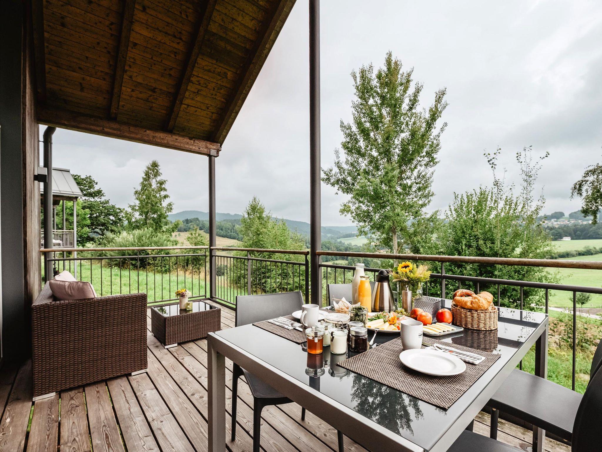 Rund um die Chalets ist viel Grün, direkt oberhalb ein kleiner Wald. In der unmittelbaren Nähe steht auch ein Hot Tub ( beheizbarer Außenbadebottich) und eine Schaukelliege mit dem Blick in die reizvolle Landschaft des bay. Waldes.