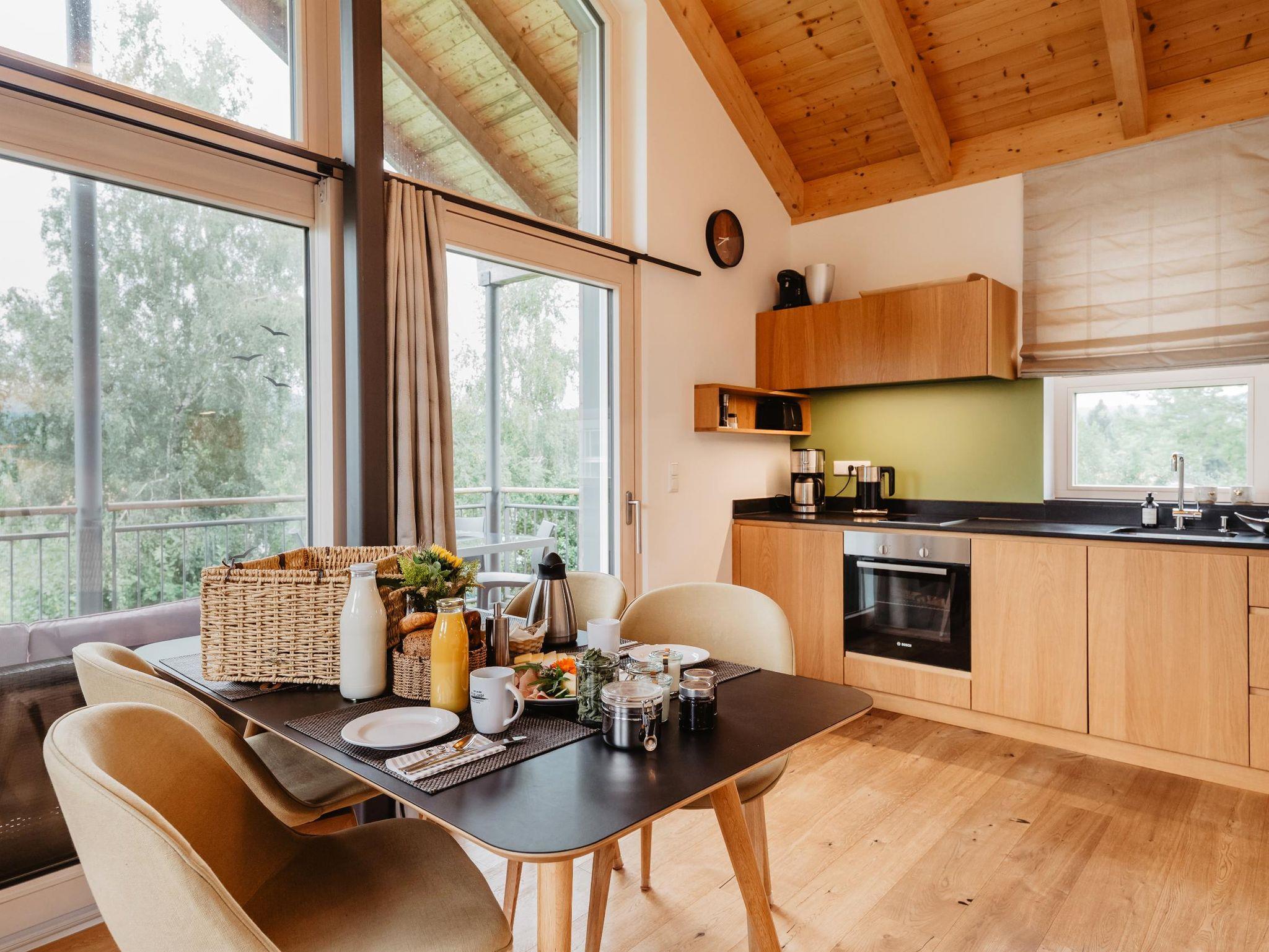Die Chalets sind jeweils für 4 Personen eingerichtet und haben insgesamt 2 Schlafzimmer ( ein Doppelbettschlafzimmer, ein Kinderzimmer mit zwei Einzelbetten), im großen lichtdurchfluteten Wohnraum mit der vollausgestatteten Küchenzeile befindet sich ein großer Esstisch, Couch und TV, von diesem Raum aus kann man zur großen, überdachten Veranda gelangen, dort steht ebenfalls ein großer Esstisch mit Gartenstühlen, sowie eine Outdoorlounge.