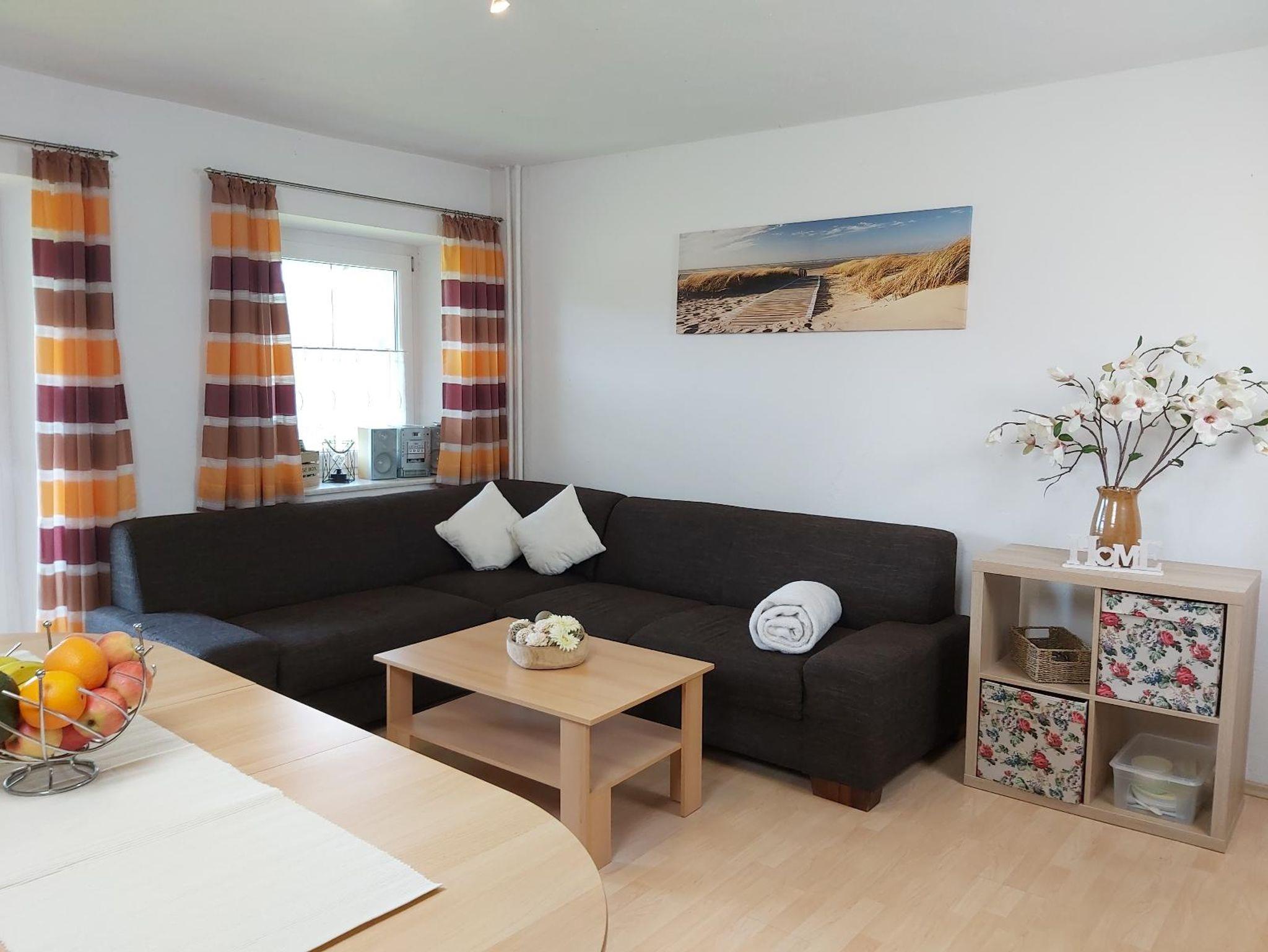 Unsere große 120qm Wohnung bietet Platz für bis zu 10 Personen. Neben einer Wohnküche mit Zugang zum Balkon bietet die Wohnung 4 Schlafräume. Ein Schlafraum im zweiten Stock mit Doppelbett, im ersten Stock auf Höhe der Wohnküche sind 2 Schlafzimmer mit jeweils einem Doppelbett und Einzelbett, ausserdem noch ein Durchgangszimmer mit einem Etagenbett. Bad mit Badewanne, Dusche und WC und ein separates WC. Die Wohnung befindet sich im Haupthaus und ist über eine Treppe zu erreichen.