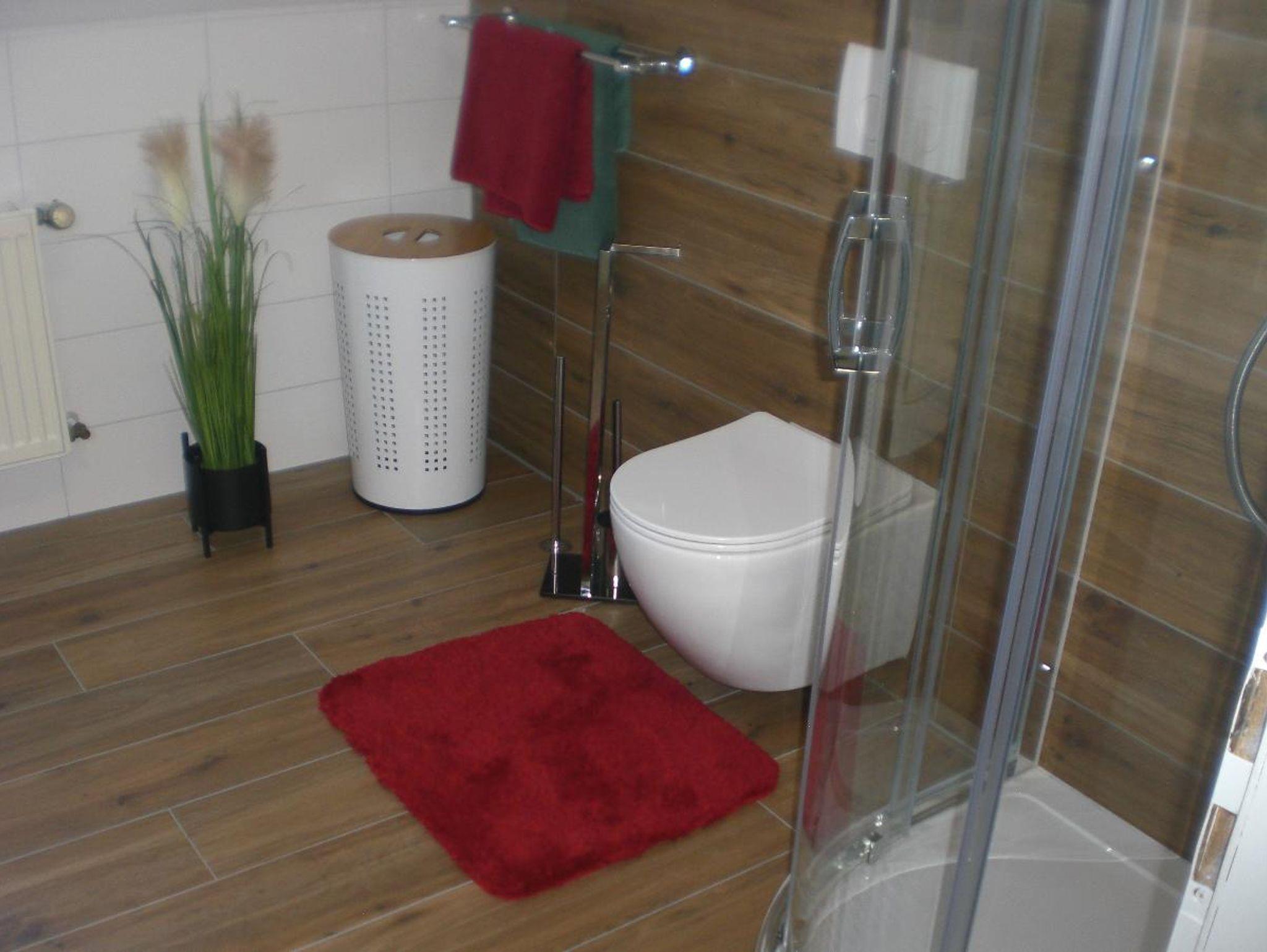 Die 80 Quadratmeter große Ferienwohnung befindet sich im ersten Stock unseres Haues und verfügt über eine Küche, ein Esszimmer, ein Wohnzimmer, ein Badezimmer und ein Schlafzimmer mit Balkon. Die Küche ist mit Kühlschrank mit Gefrierfach, Backofen, Herd, Kaffeemaschine, Mikrowelle und Geschirrspülmaschine voll ausgestattet. Das Esszimmer verfügt über eine gemütliche Sitzecke. Im Wohnzimmer stehen Ihnen ein Sofa sowie TV und Radio zur Verfügung. Das separate Schlafzimmer ist mit einem Doppelbett und einem Kleiderschrank ausgestattet. Bettwäsche und Handtücher sind kostenfrei vorhanden. Vom Schlafzimmer aus haben Sie Zugang zu Ihrem eigenen Balkon. Das Badezimmer verfügt über Dusche, Waschbecken, WC und Fön. Waschmaschine und Wäscheständer sind vorhanden. Auch Bademäntel sind inklusive.