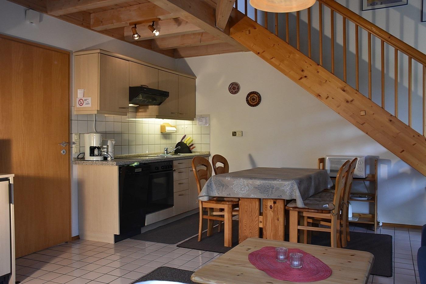 Im EG: Wohnschlafraum mit Polstersitzgruppe (mit DB-Schlafcouch), Farb-TV, Essplatz für 4 Personen, Küchenzeile mit E-Herd (Backrohr, Wasserkocher, Toaster und Kaffeemaschine),