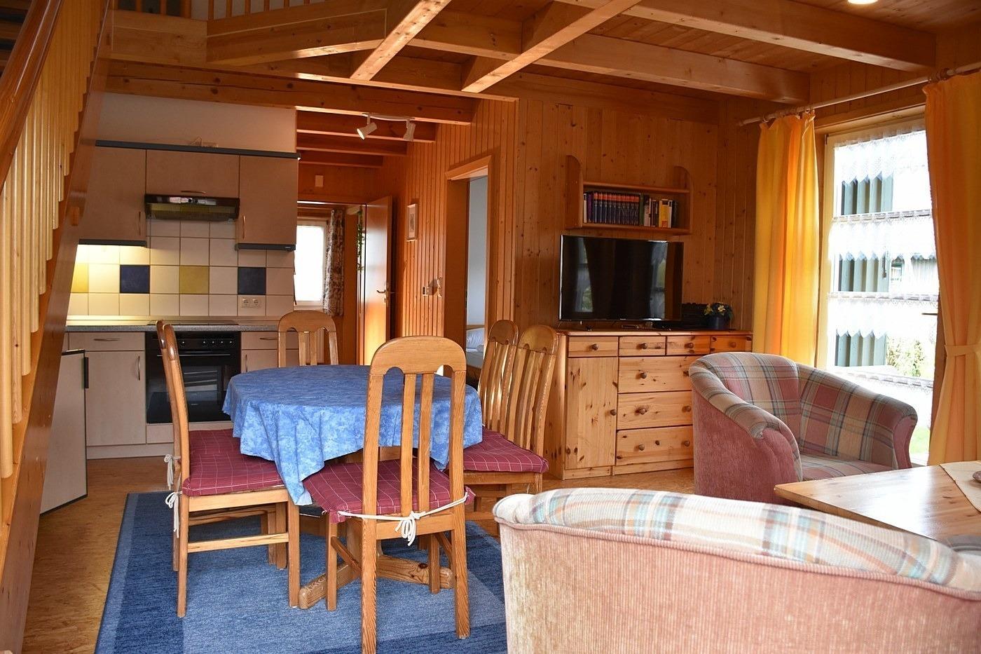 Im EG: Wohnschlafraum mit Doppelbettcouch, Farb-TV, Essplatz für 6 Personen, Küchenzeile mit E-Herd (Geschirrspüler, Backrohr, Mikrowelle, Toaster und Kaffeemaschine),