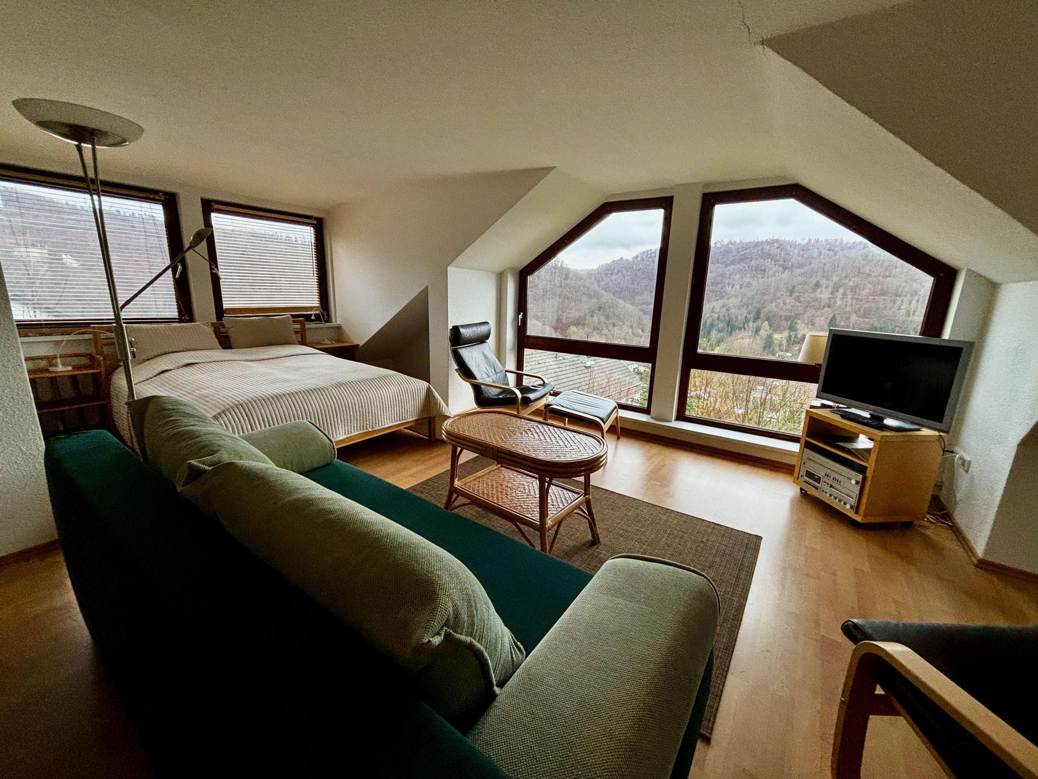 Von der Diele aus führt eine Treppe zum Attik mit einem geräumigen Wohnschlafzimmer mit großen Fenstern. Zentrale Sitzgruppe mit Ausblick über das Wiedatal. Ein Doppelbett und ein Einzelbett befinden sich an den beiden Extremitäten des Raumes. Digital-Kabel-TV, Radio und freier, verstärkter WLAN-Anschluss. Handtücher sind inklusive. Bettwäsche können Sie gegen Aufpreis dazubuchen.